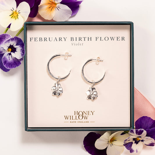 February Birth Flower Hoop Earrings - Violet - Silver - 2cm