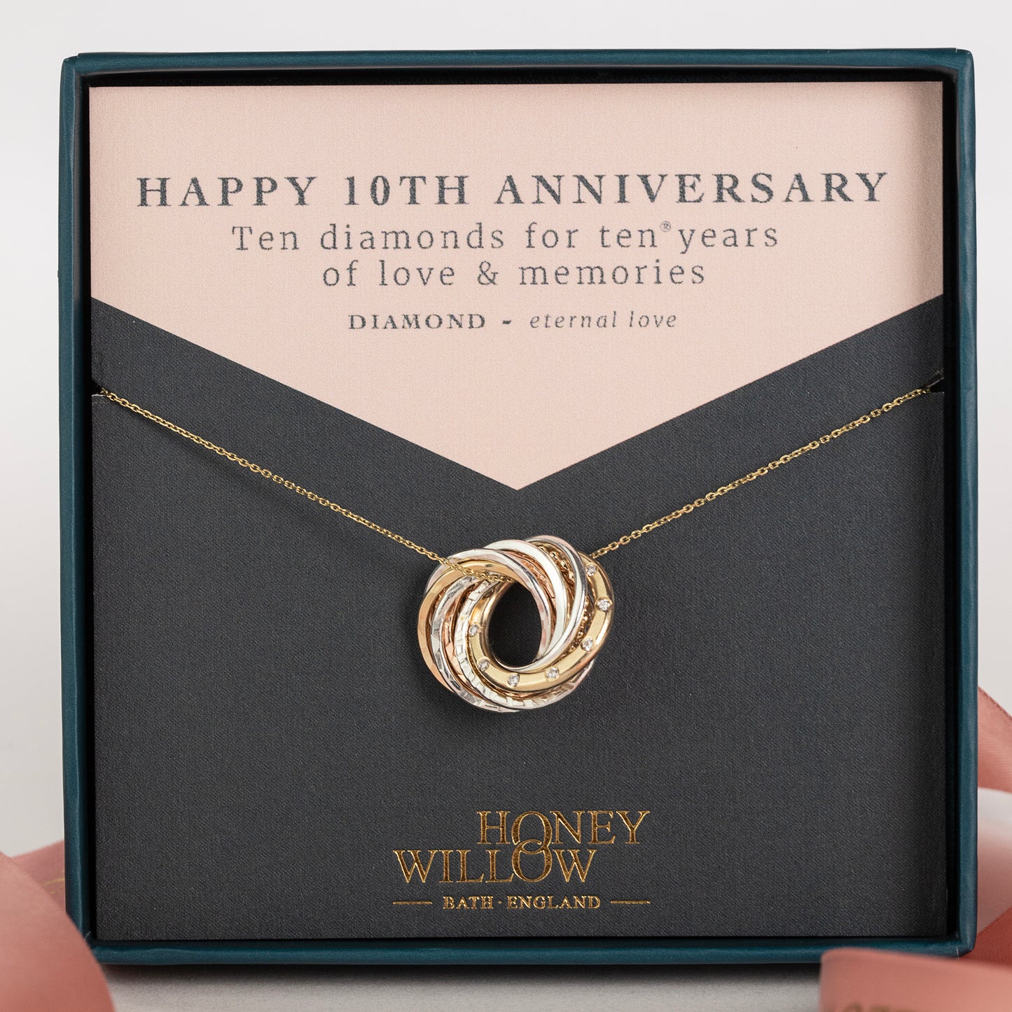 10th Anniversary Necklace - 10 Diamonds for 10 Years - 9kt Gold - Rose Gold - Silver