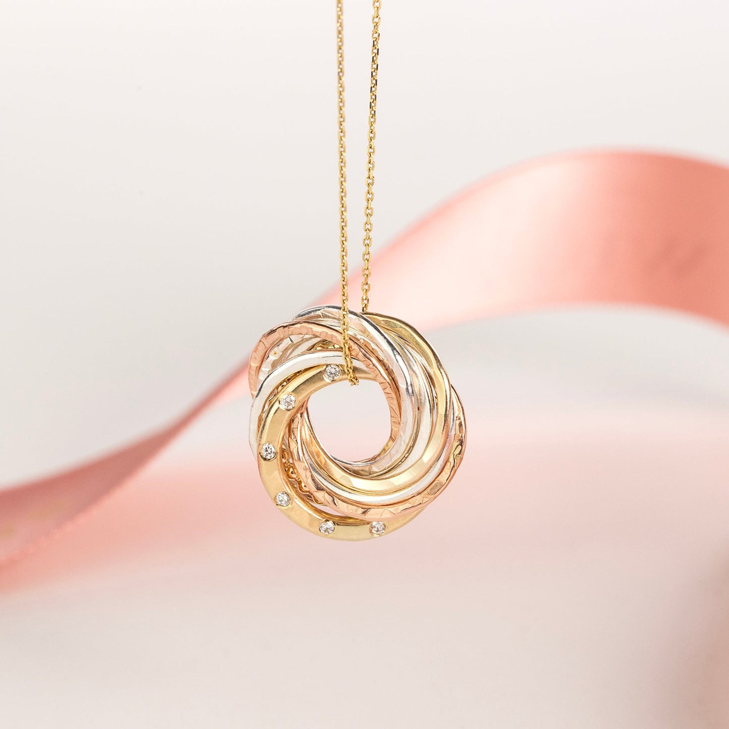 Handmade to order with recycled 9kt rose gold, recycled 9kt yellow gold, recycled sterling silver and ten conflict-free diamonds. The pendant is hallmarked at the London Assay Office, so please allow up to two week making time.