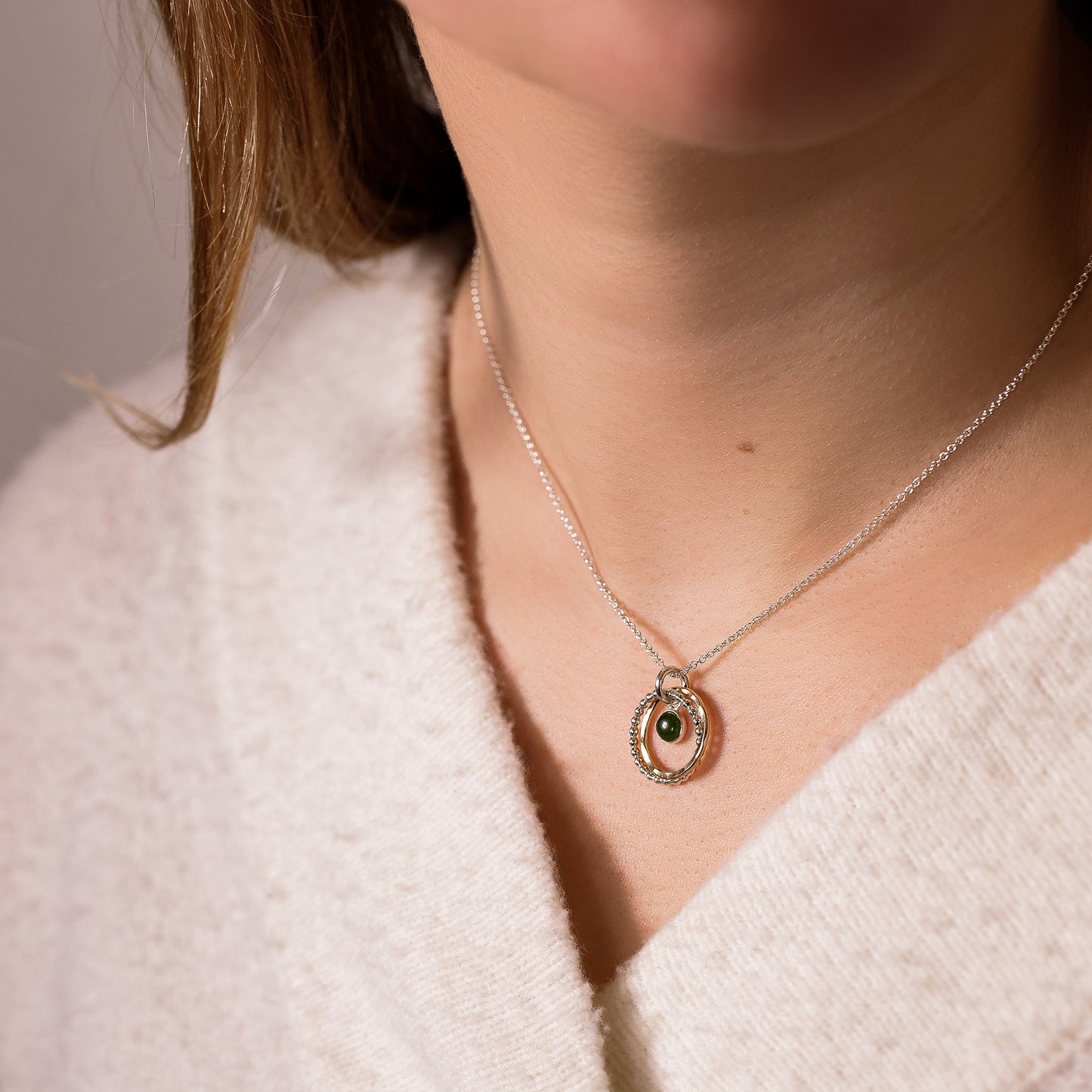 Circles symbolise infinite love, strength and protection. Two circles are linked for a lifetime® and encircle a jade stone, which symbolises the twelfth anniversary.