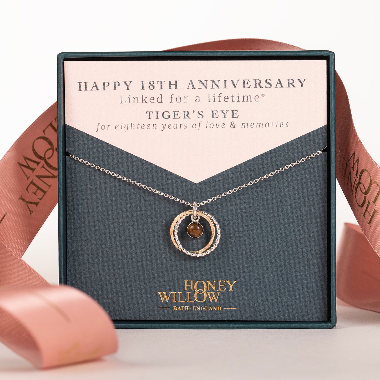 Circles symbolise infinite love, strength and protection. Two circles, linked for a lifetime® encircle a tiger's eye stone, which symbolises the eighteenth anniversary.