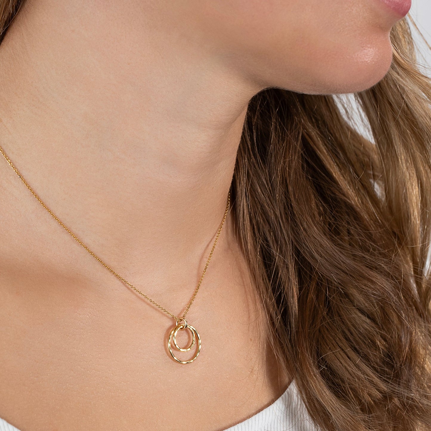 This petite double circle necklace is handmade with either hammered silver, beaded silver or 18k gold plating over silver.