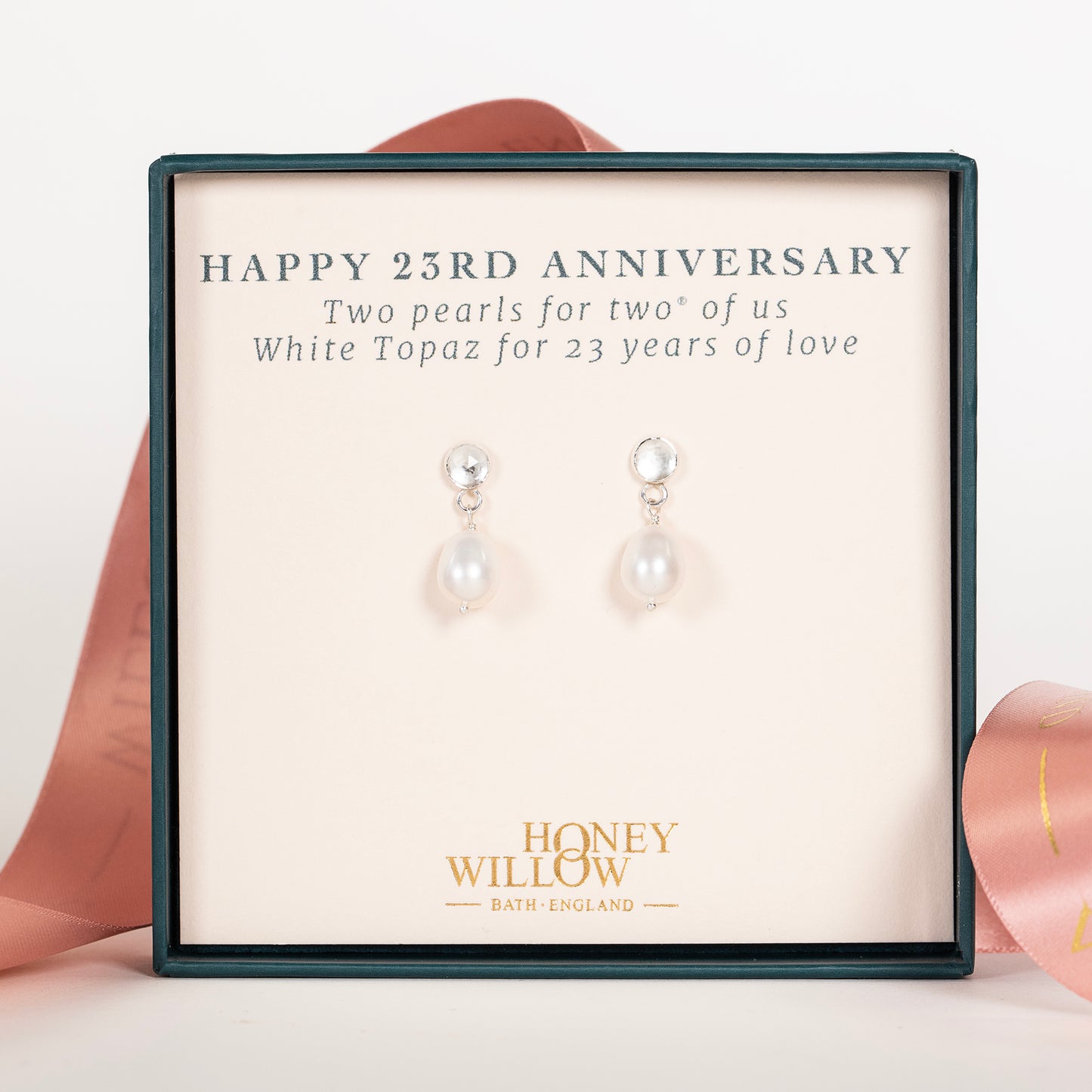 Celebrate your 23rd anniversary with topaz and pearl earrings.