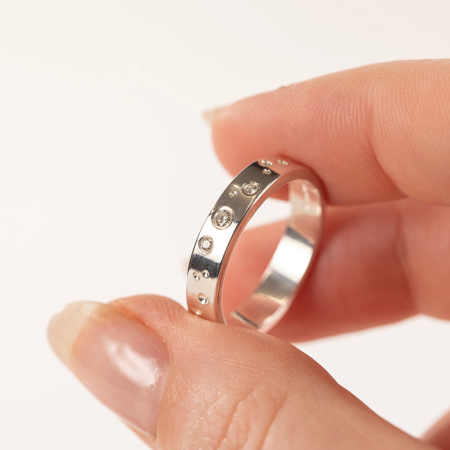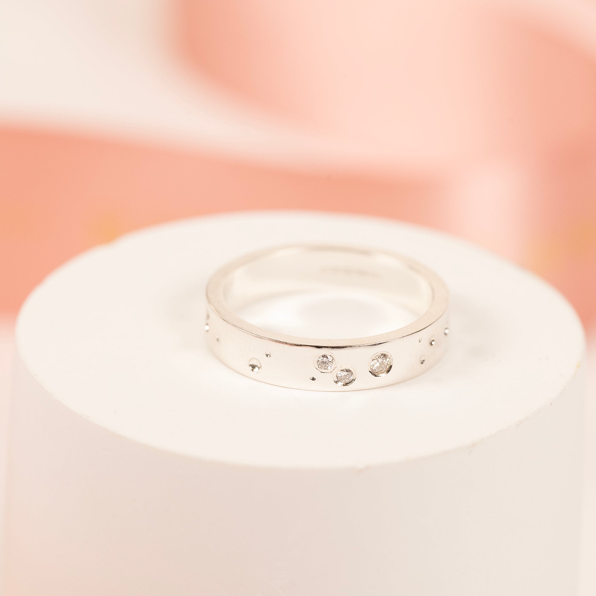 Handmade with three lab grown diamonds for three® decades and a pattern reminiscent of bubbles, which signify joy and living in the moment.