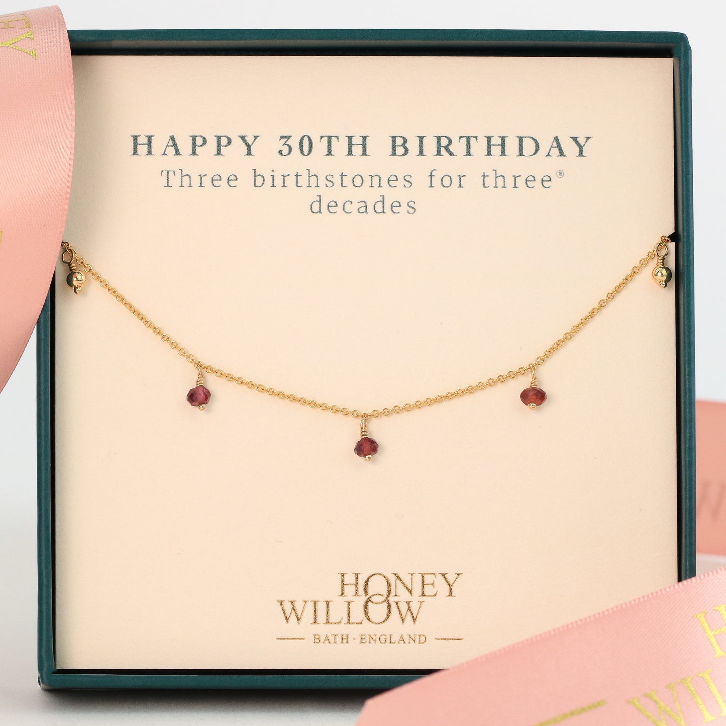 Celebrate your loved one's 30th birthday with this delicate necklace, handmade with her birthstone - three birthstones for three decades.