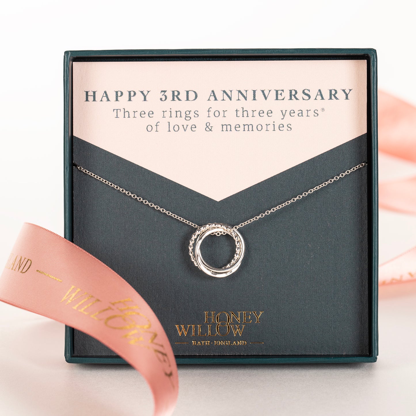 Celebrate your 3rd anniversary with a three rings for three years® necklace.