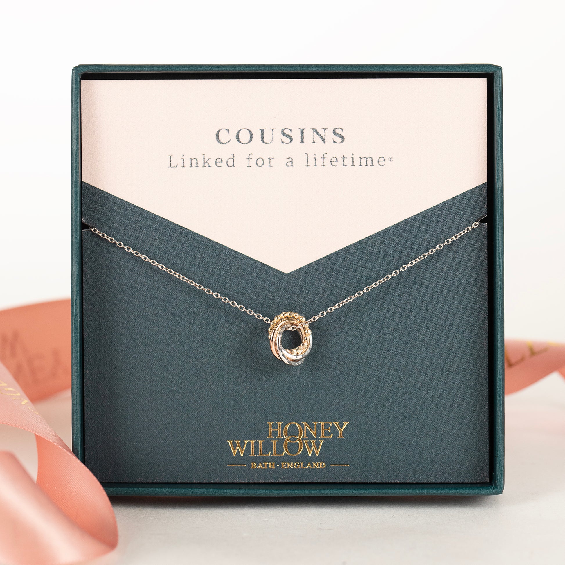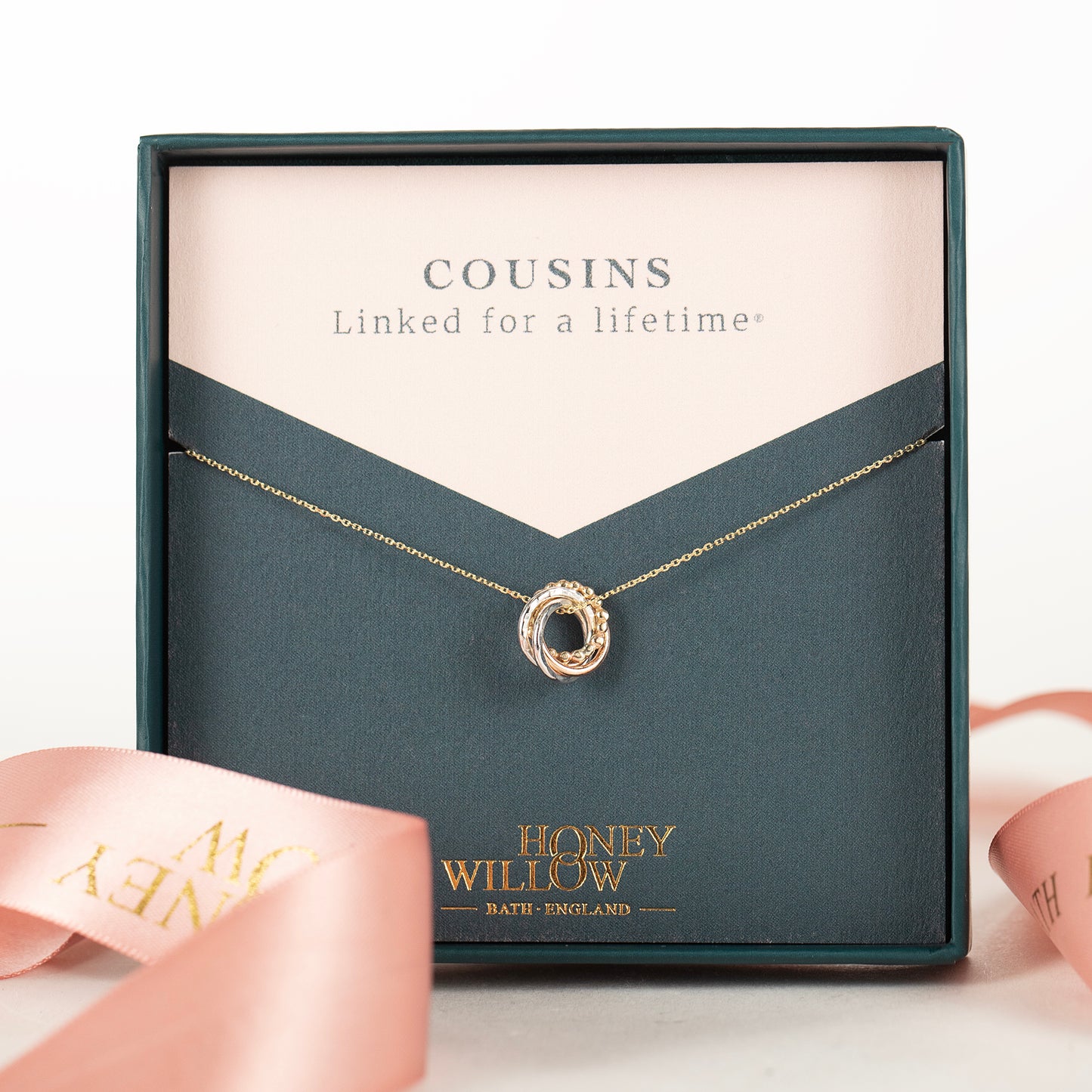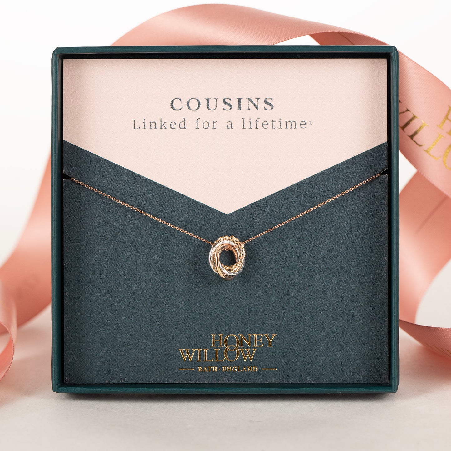 Celebrate the bond between four cousins with a 9kt gold, rose gold and silver love knot necklace.