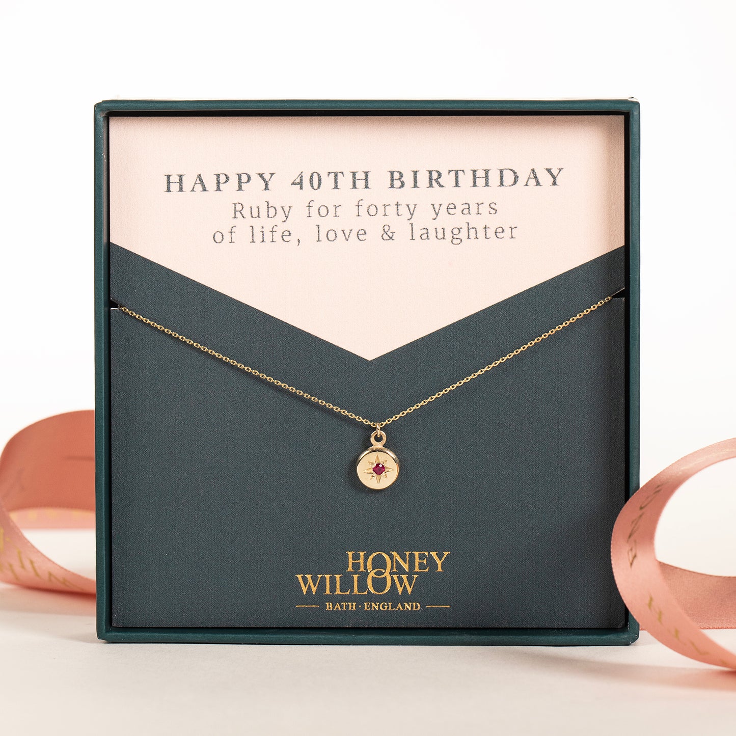 Celebrate her 40th birthday with a dainty 9kt gold pendant, star-set with a tiny ruby, which symbolises 40 years.