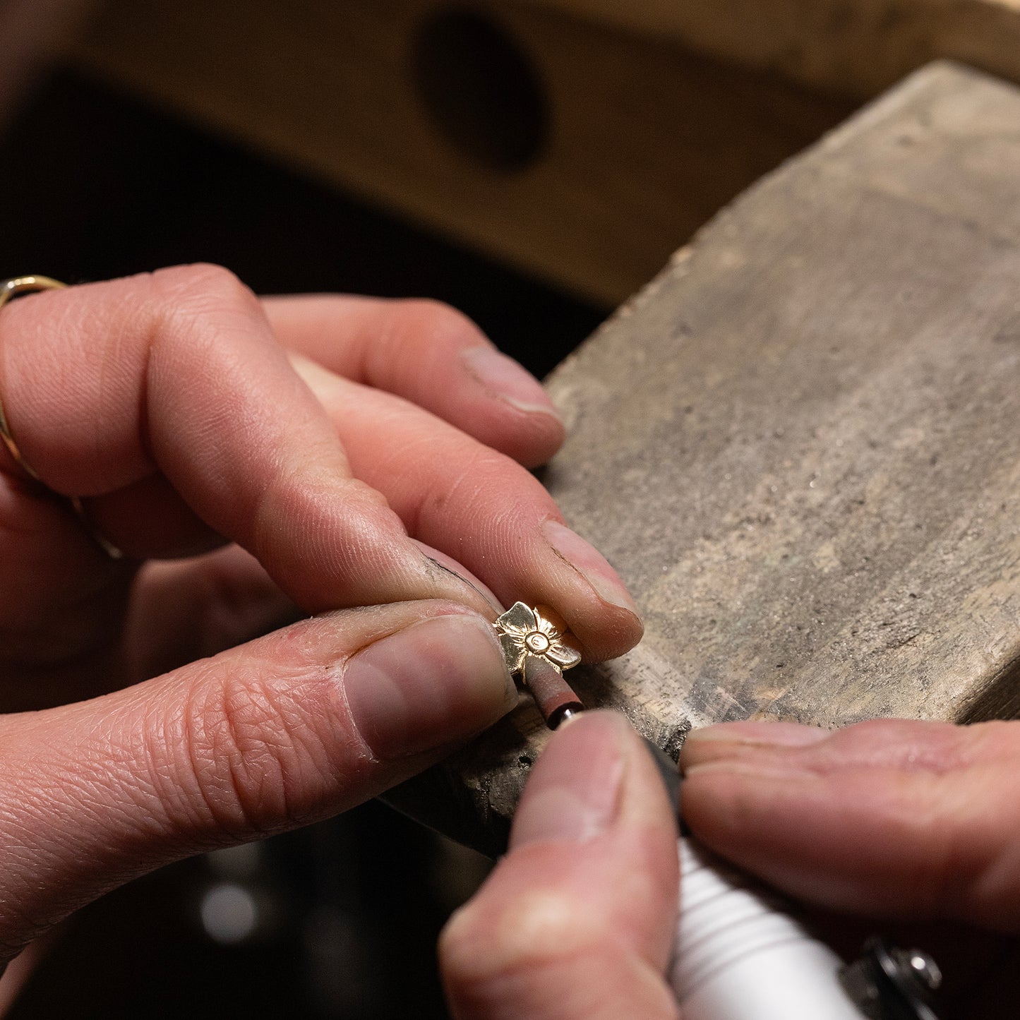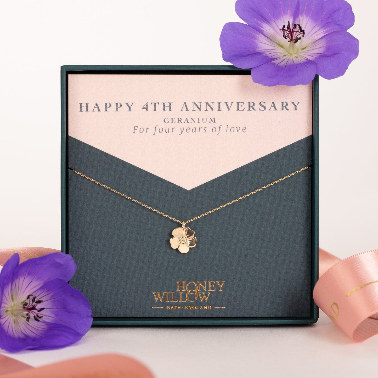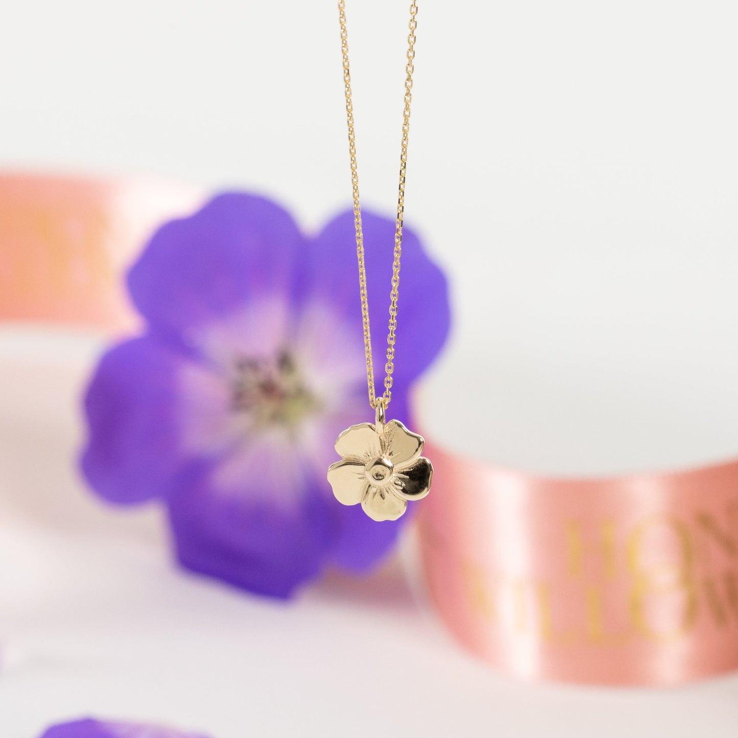Celebrate your 4th anniversary with a unique geranium flower necklace, made with recycled 9kt gold.