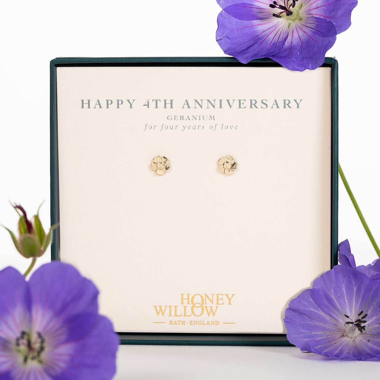 Celebrate your fourth anniversary with 9kt gold geranium flower stud earrings.