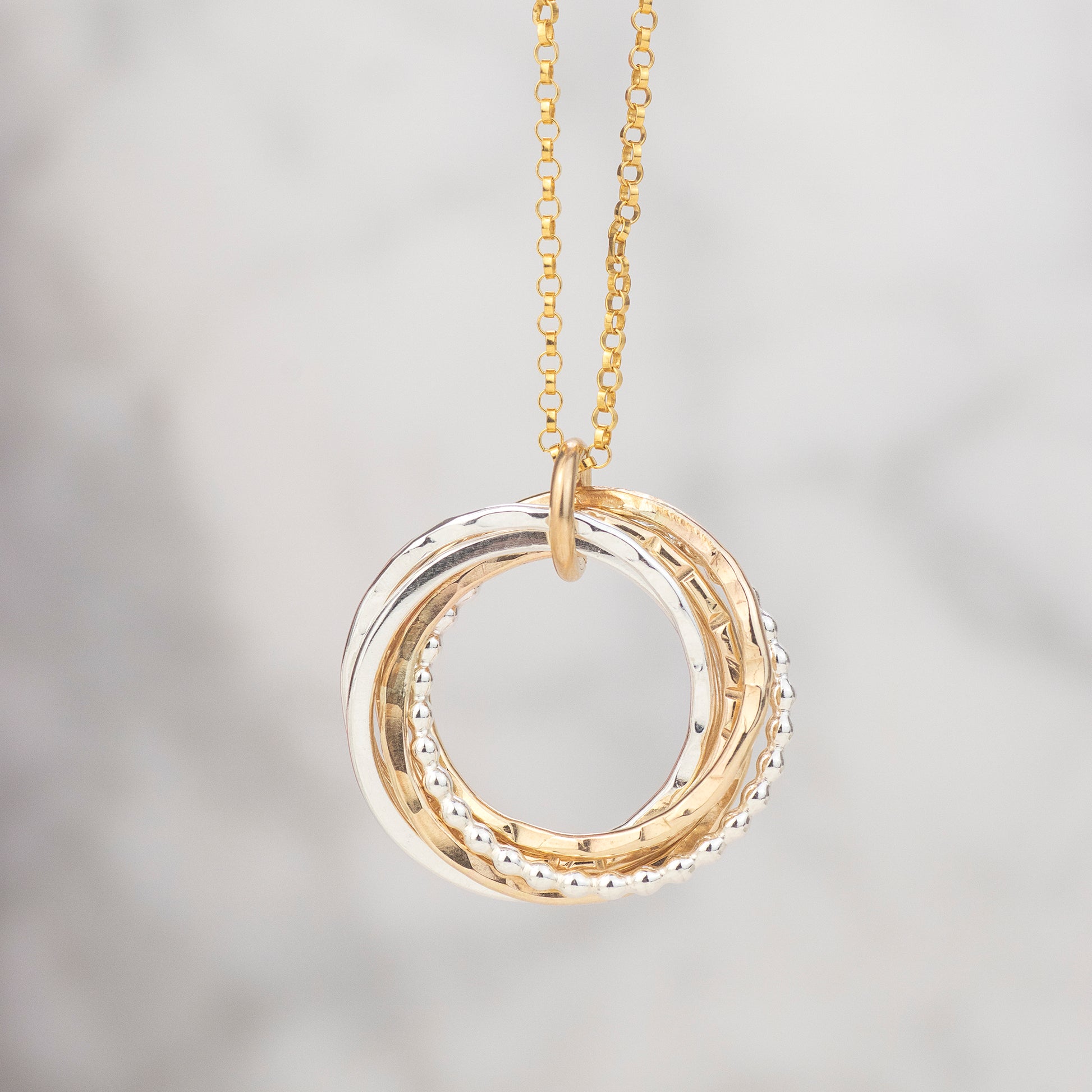 Circles symbolise infinite love, strength, protection and unity. We make her pendant with six linked circles, giving each link a different texture to represent each unique year.