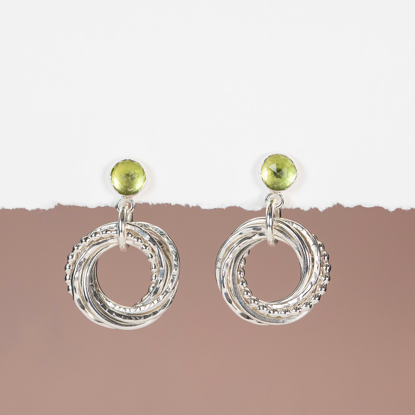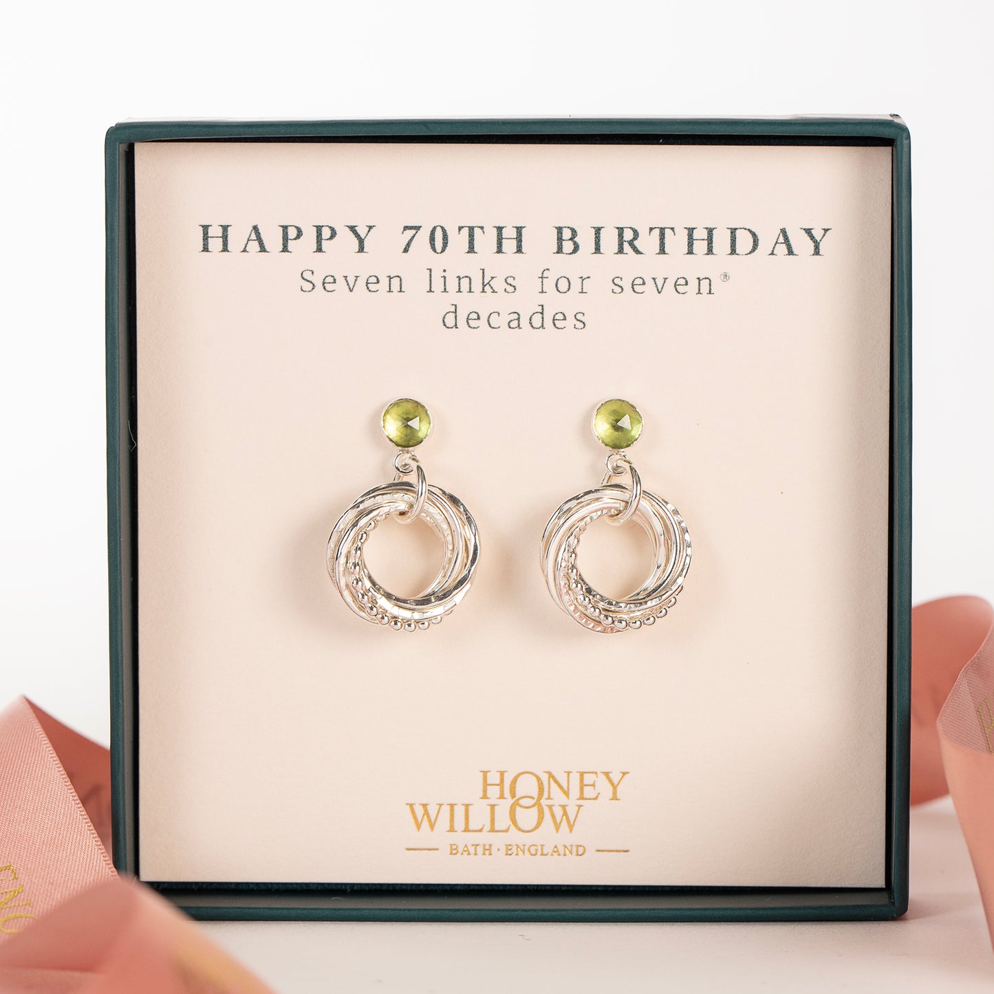 Circles symbolise infinite love, strength, protection and unity. Seven circles are linked on each earring, to represent her seven decades. You choose her birthstone, see image 3 for examples.