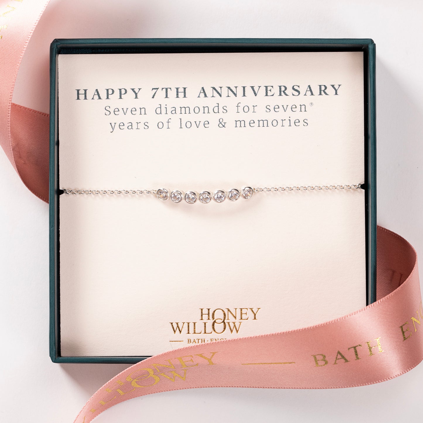 Give her a seven diamonds for seven® years bracelet, designed and handmade in Bath, England. Honey Willow is a family business, founded in 2010.