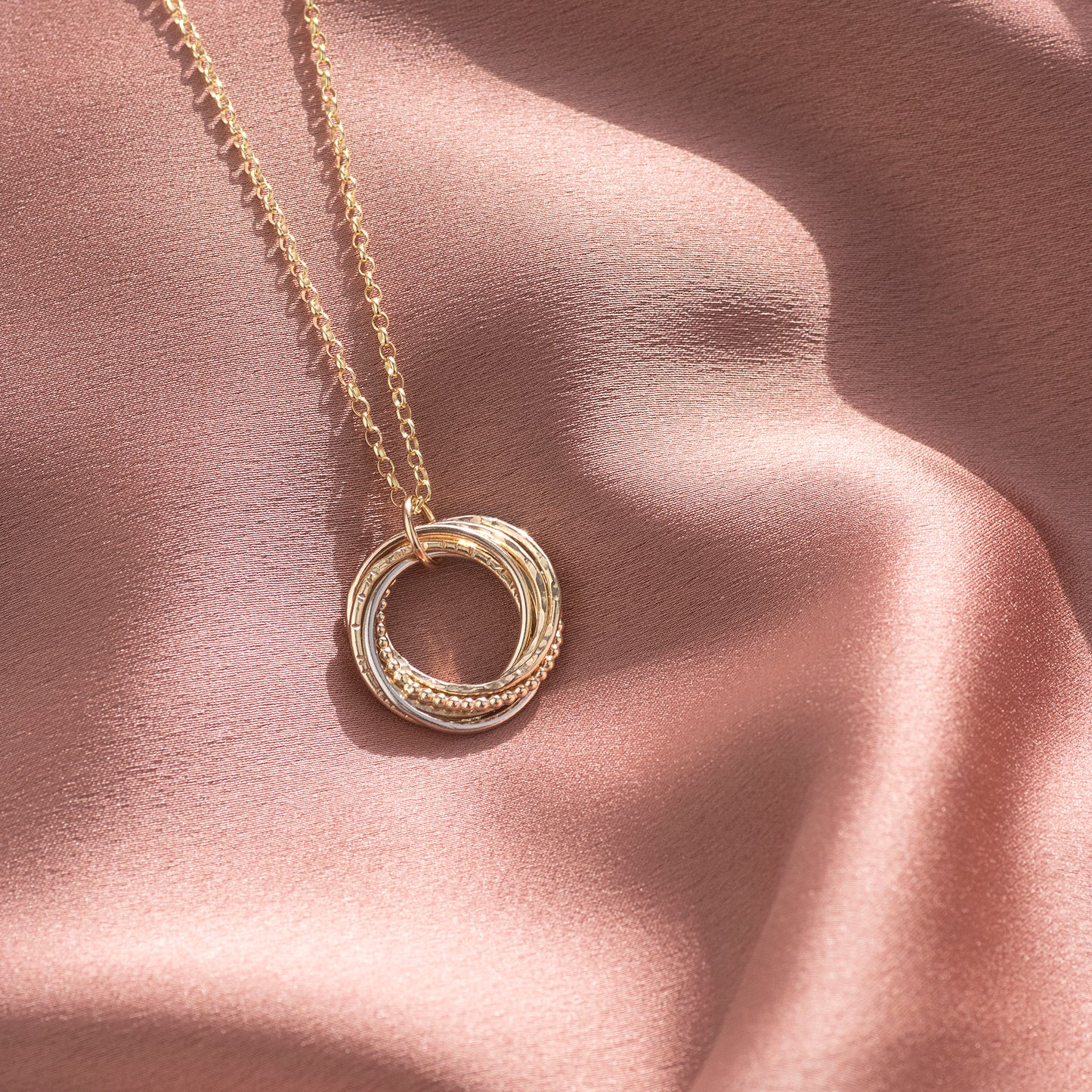 Circles symbolise infinite love, strength, protection and unity.  We make her pendant with seven linked circles, giving each link a different texture to represent each unique decade.