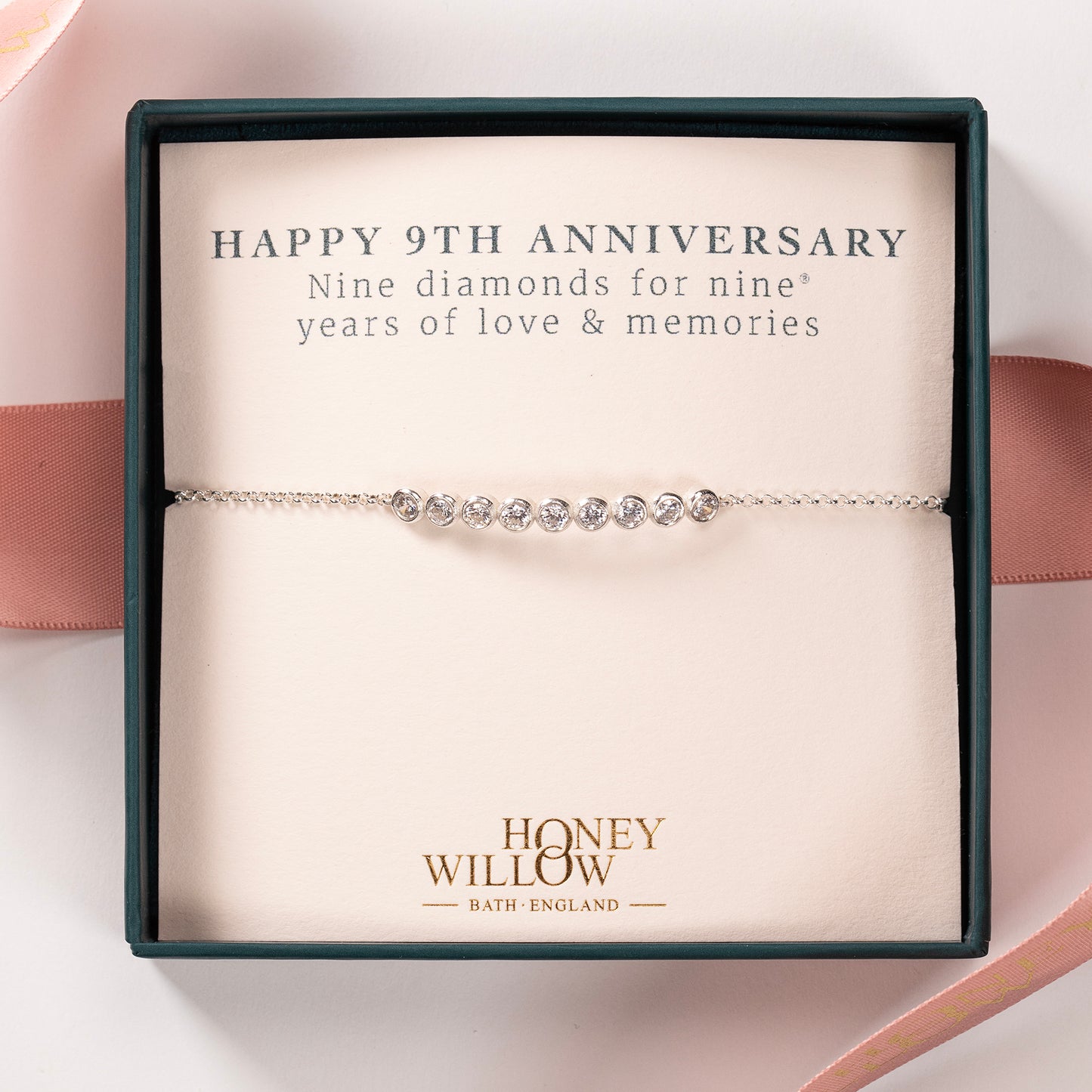 Give her a nine diamonds for nine® years bracelet, designed and handmade in Bath, England. Honey Willow is a family business, founded in 2010.