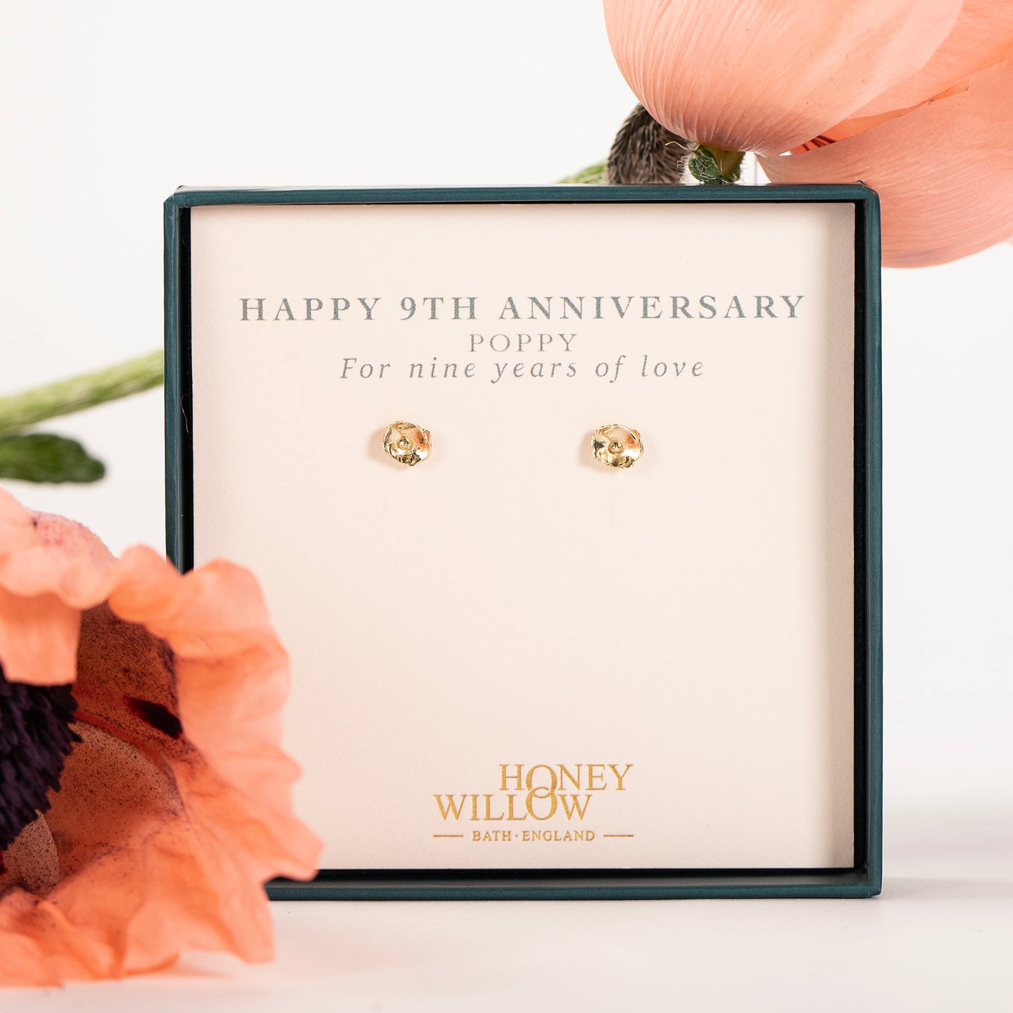 Celebrate your ninth anniversary with unique poppy flower stud earrings.