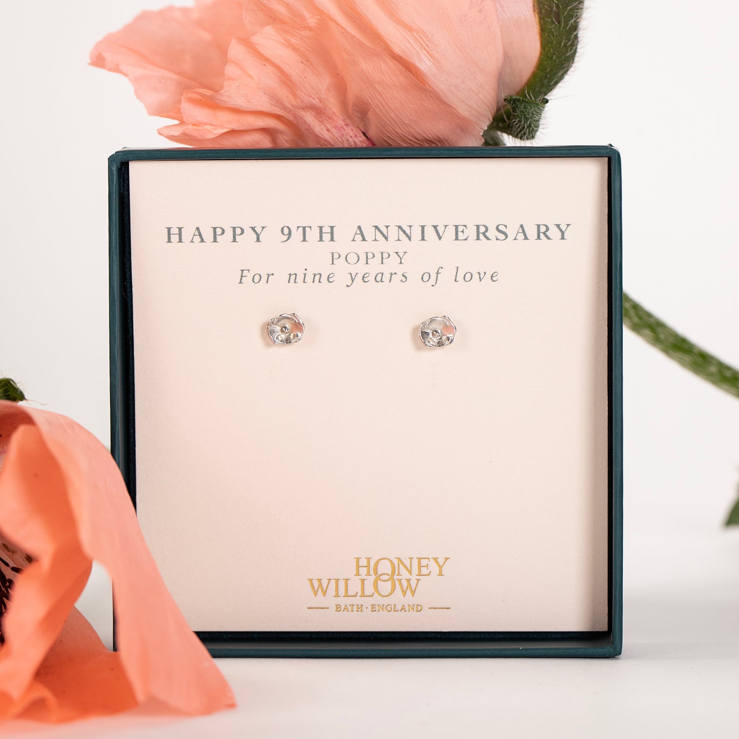 Celebrate your ninth anniversary with unique poppy flower stud earrings.