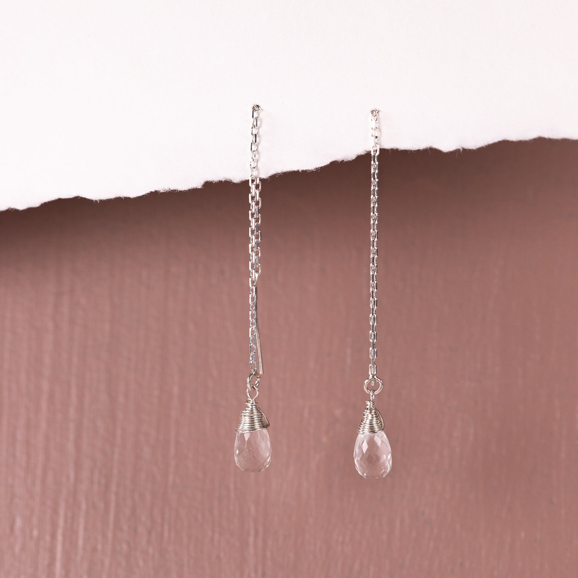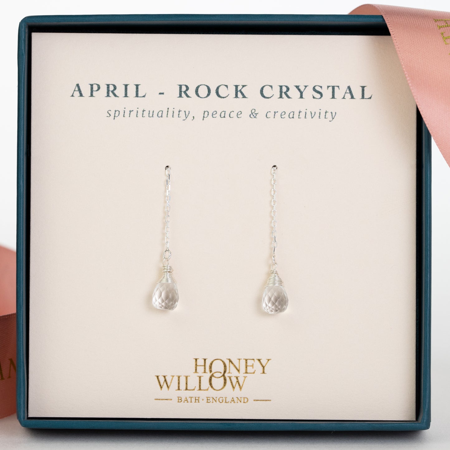 These long delicate birthstone threader earrings are made with rock crystals, which is a birthstone for April.
