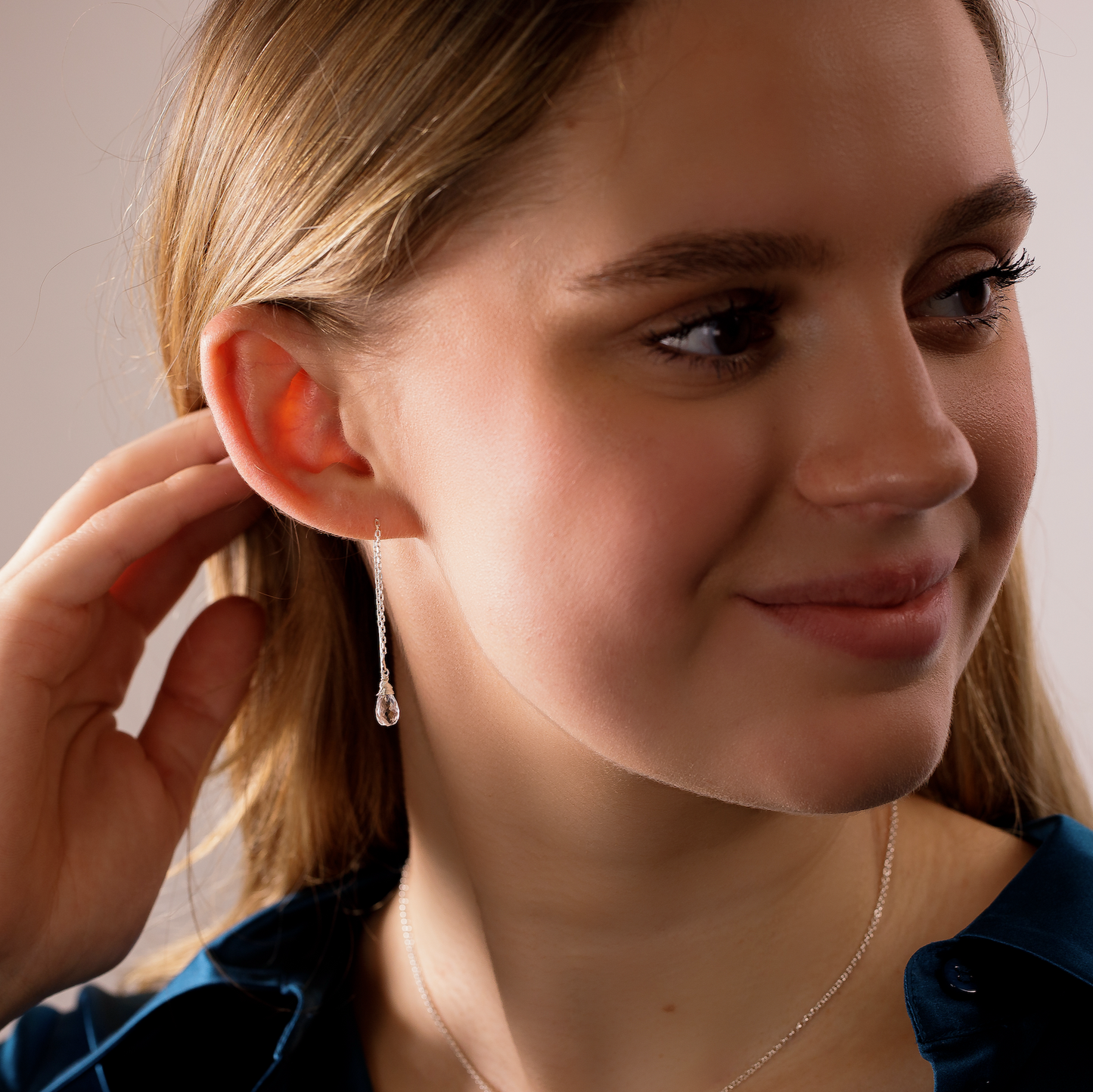 The earrings are made with fine, delicate chain which is threaded through a pierced ear and adjusted so that the birthstone sits where the wearer prefers.