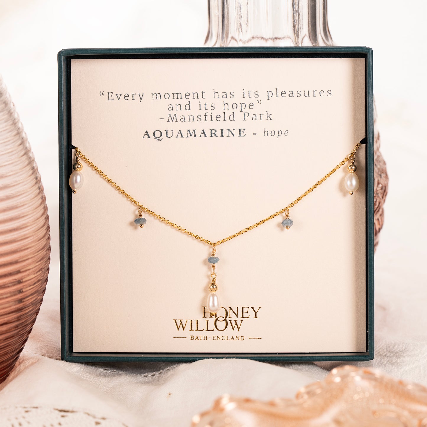 This dainty aquamarine and pearl drop necklace comes with a quote from Jane Austen's Mansfield Park.