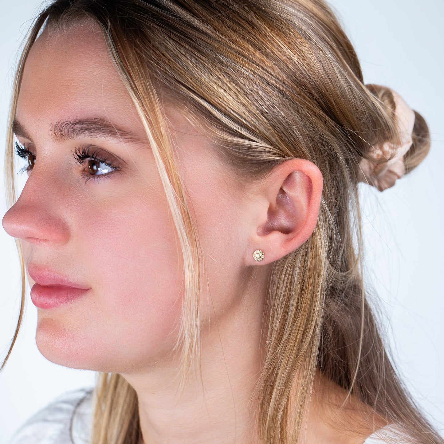 The sunflower stud earrings are 5mm in size. They are hallmarked at the London Assay Office.