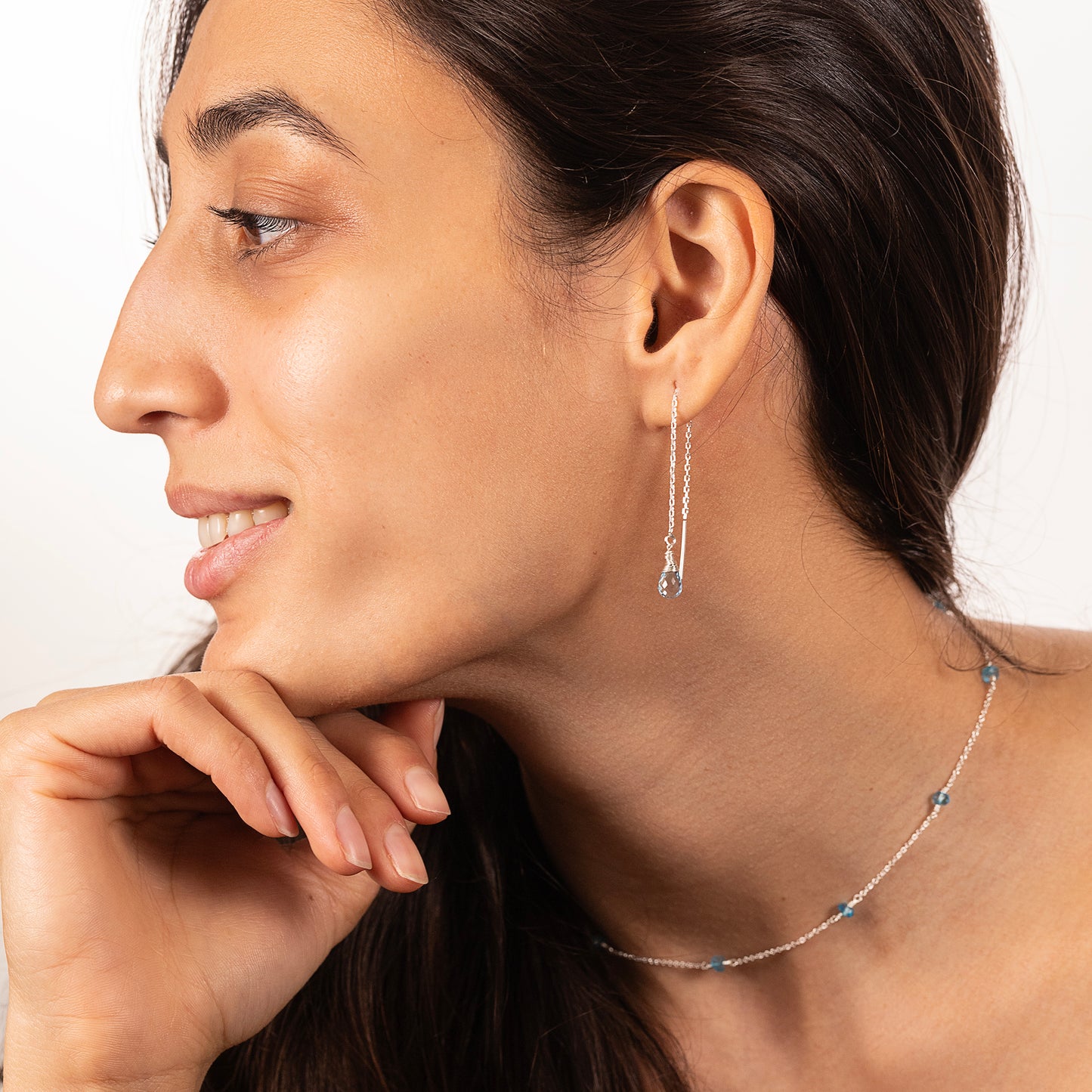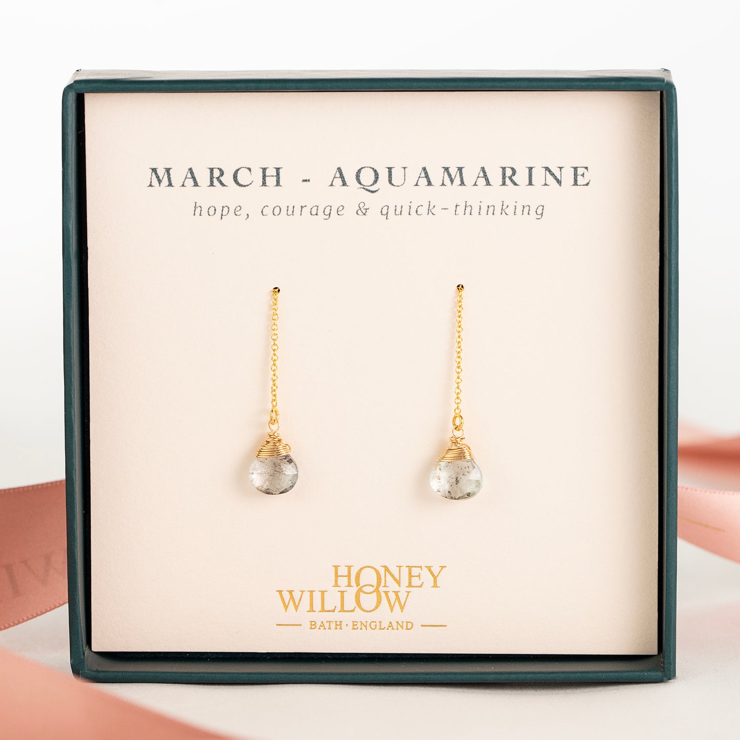 The earrings are made with fine, delicate chain which is threaded through a pierced ear and adjusted so that the birthstone sits where the wearer prefers.