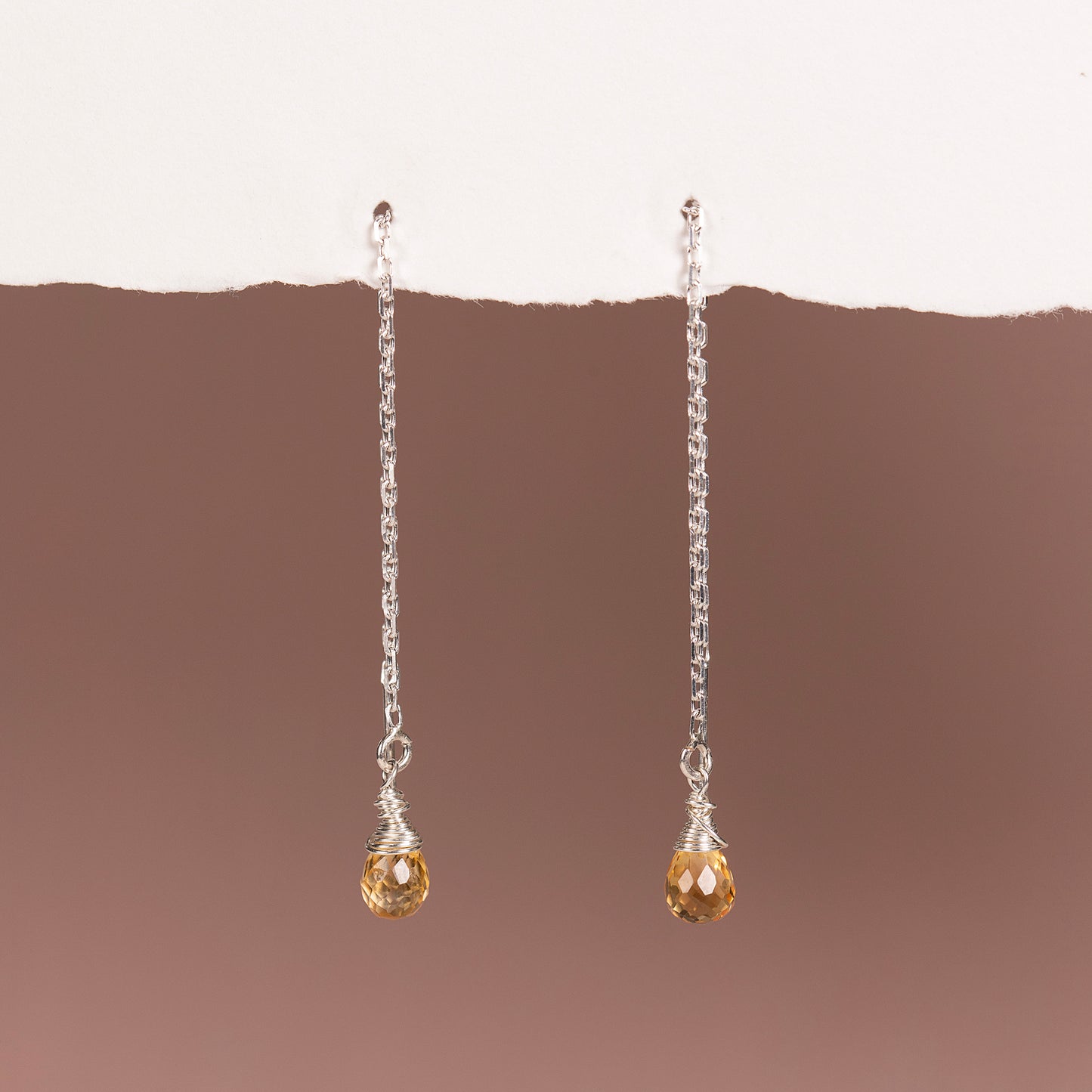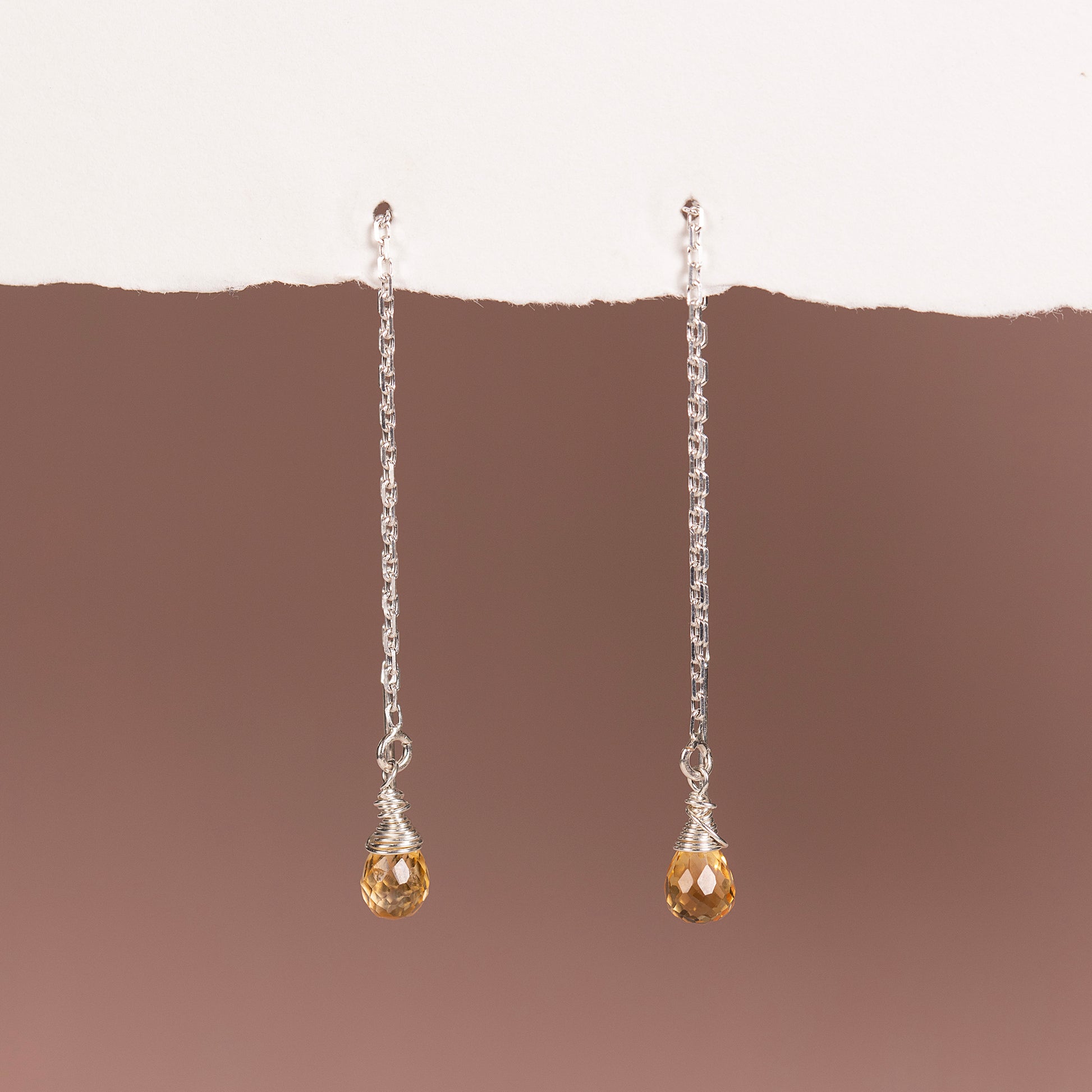 These long delicate birthstone threader earrings are made with the wire-wrapped birthstone of your choice.