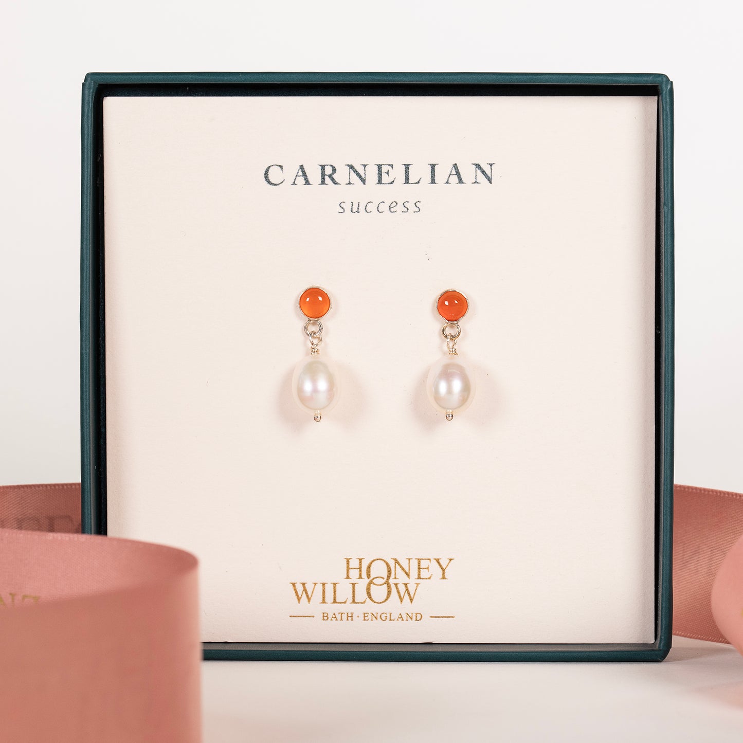 These earrings are handmade with freshwater pearls and carnelian stones, which symbolise success.