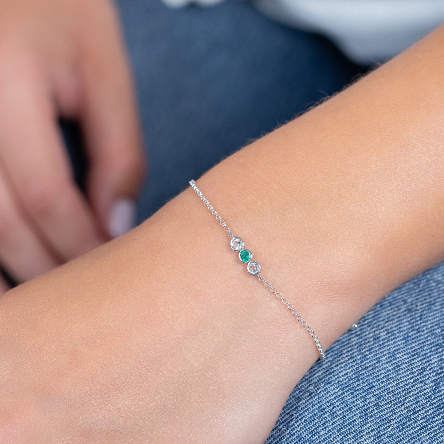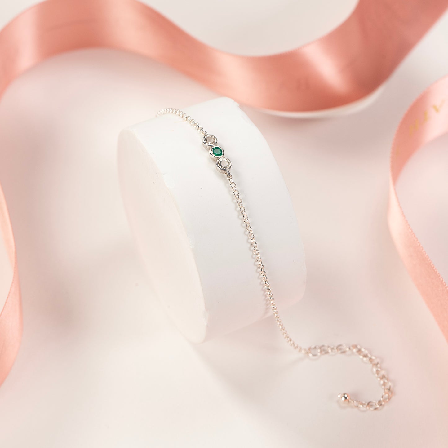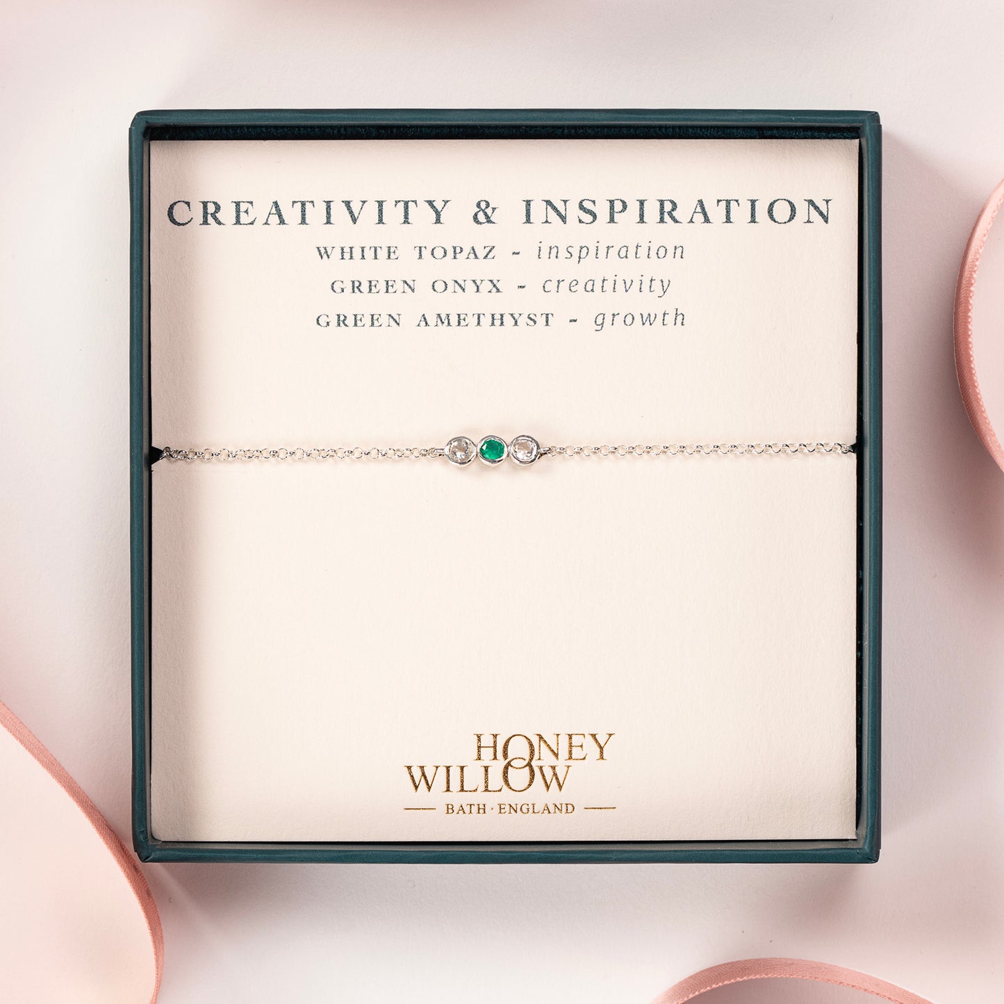 This dainty bracelet is made with three meaningful gemstones. White topaz symbolises inspiration, green onyx symbolises creativity and green amethyst symbolises growth.