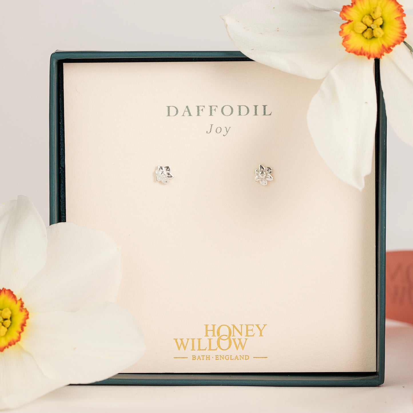 These dainty daffodil stud earrings are made with recycled sterling silver.