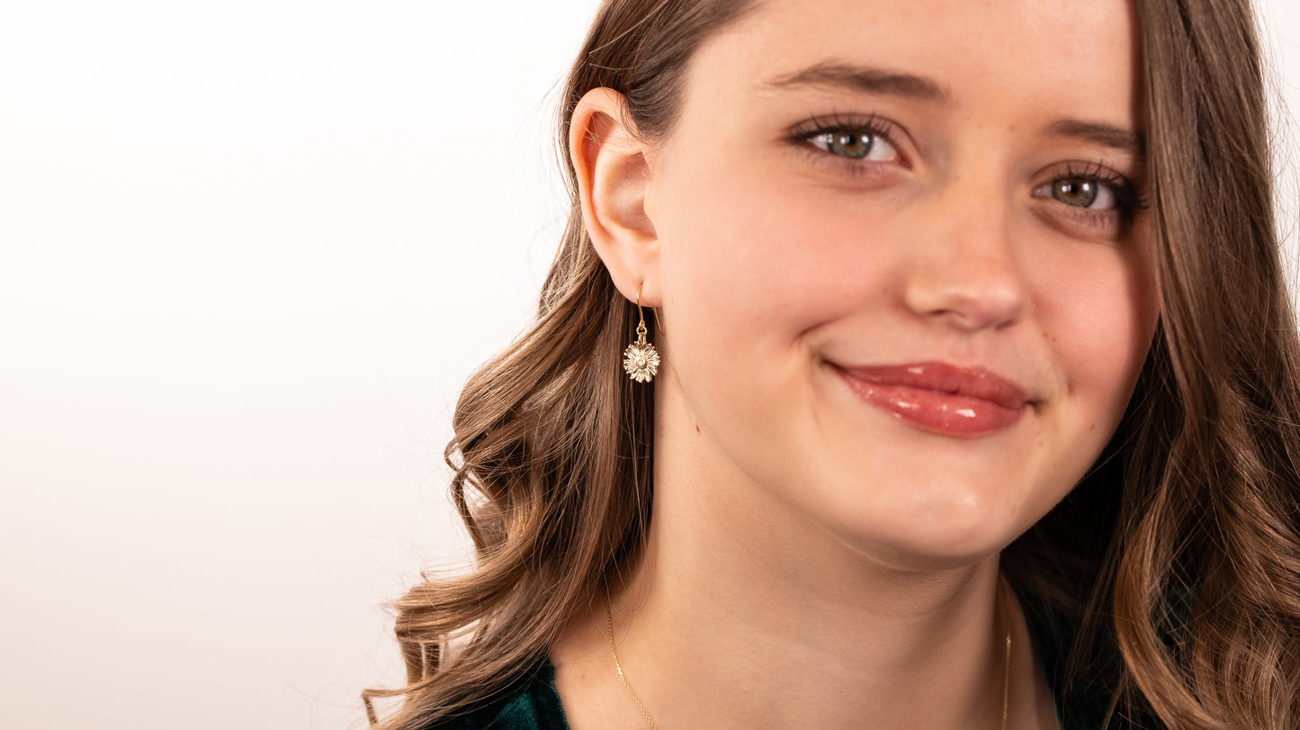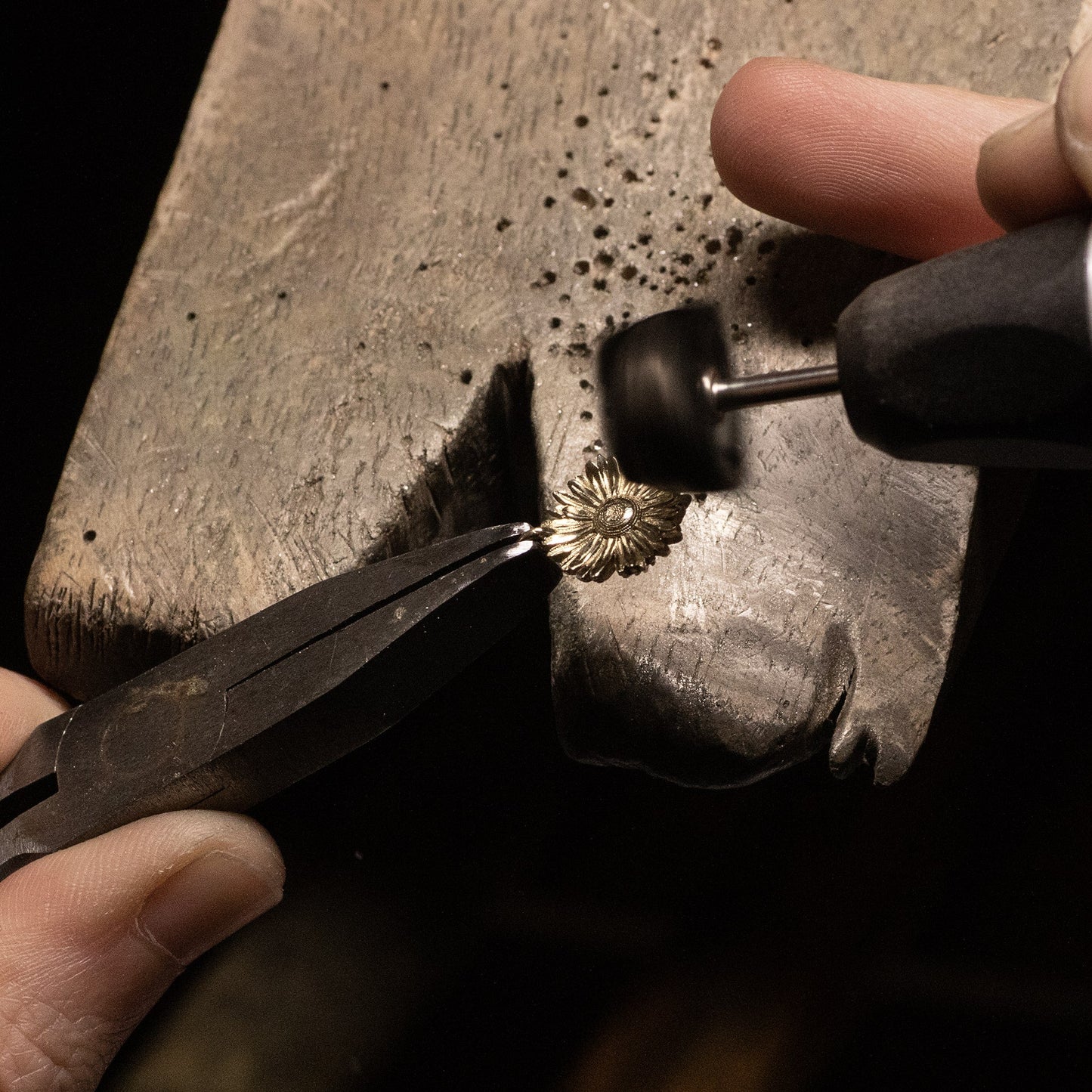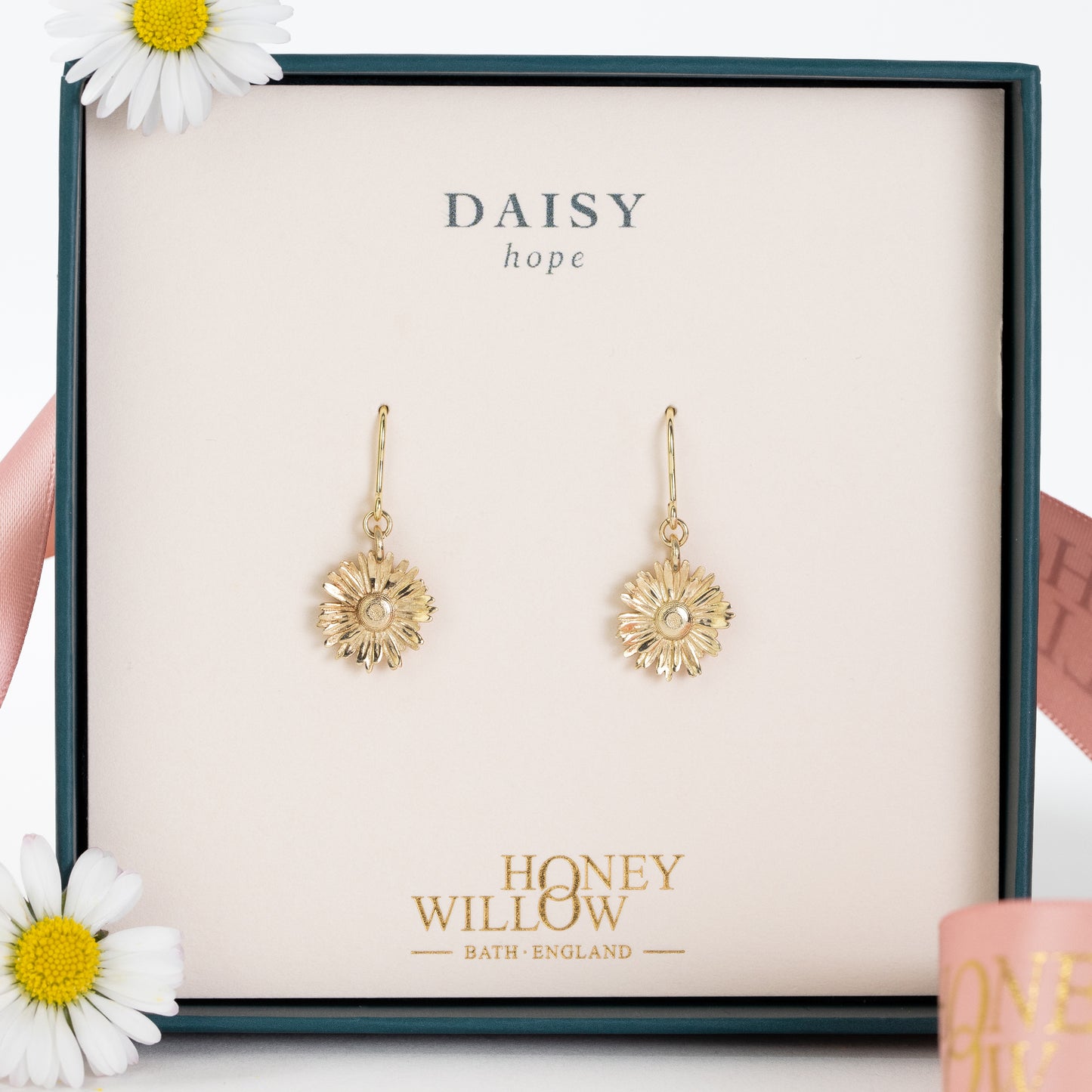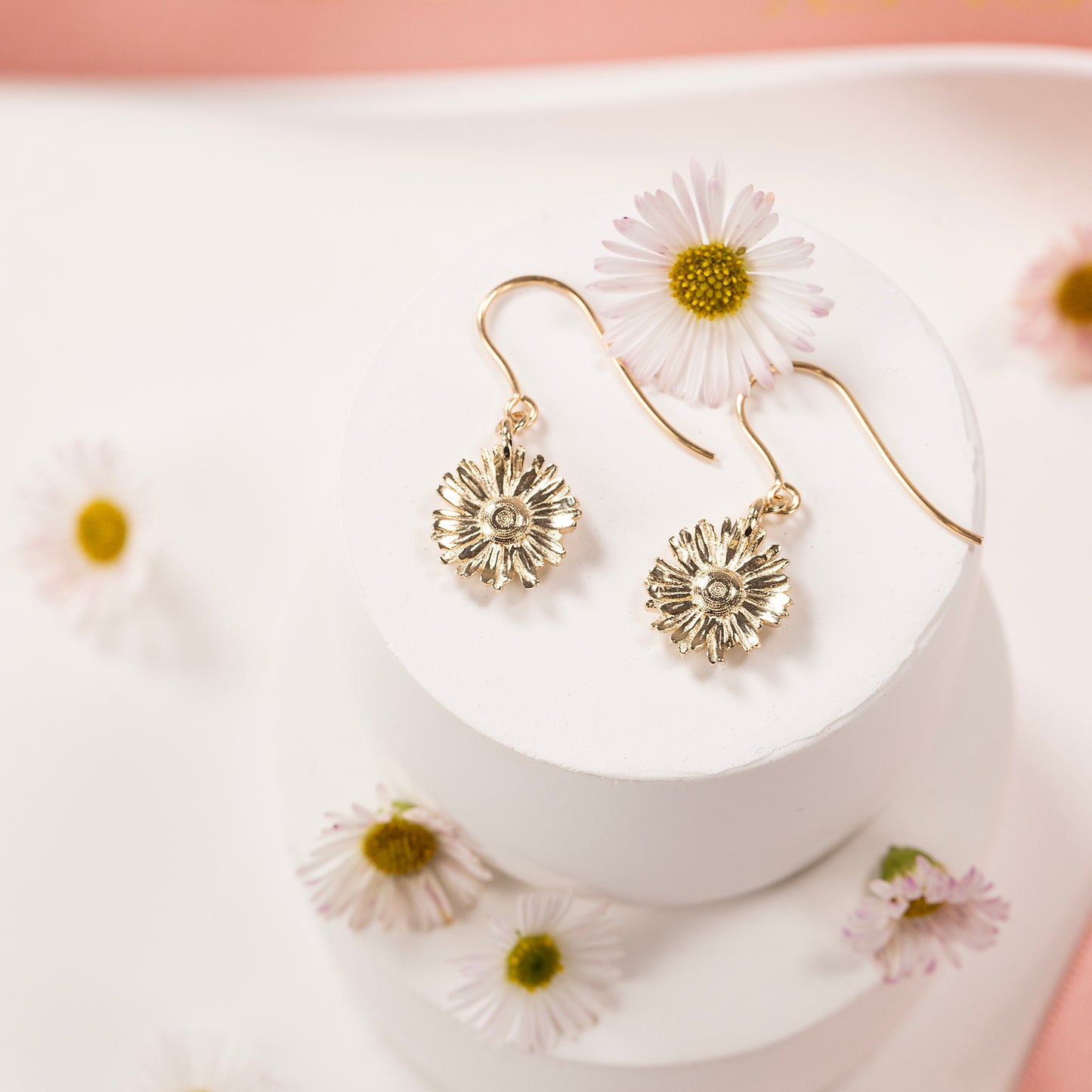 The dainty daisy flower earrings are handmade with recycled 9kt gold.