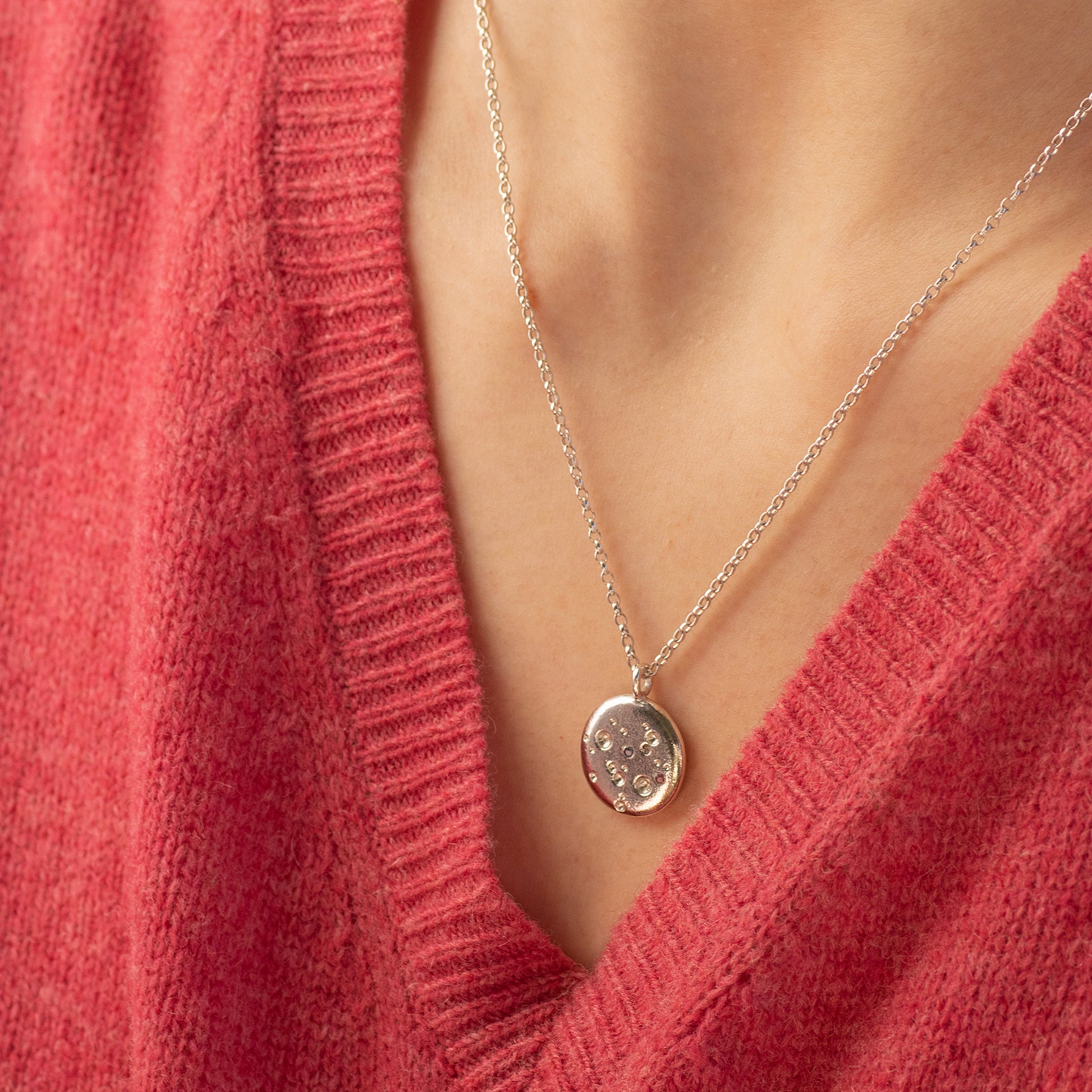Celebrate with a silver pendant symbolising happiness and celebration. Handmade with two birthstones for two® loved ones and a pattern reminiscent of bubbles, which signify joy and living in the moment.