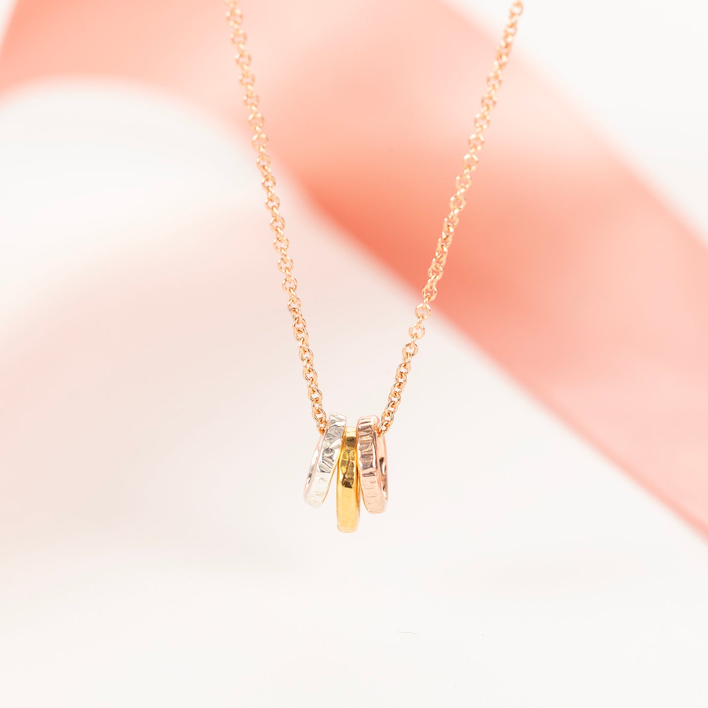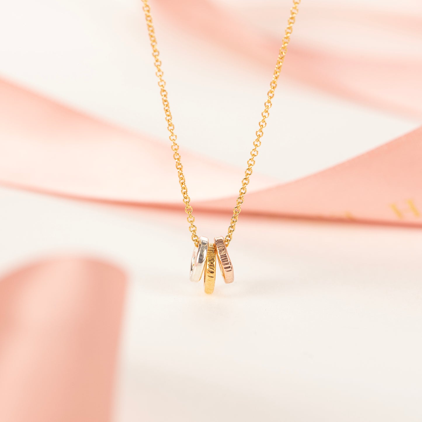 Circles symbolise infinite love, strength, protection and unity. We make her pendant with three linked circles, giving each link a different texture to represent each individual loved one.