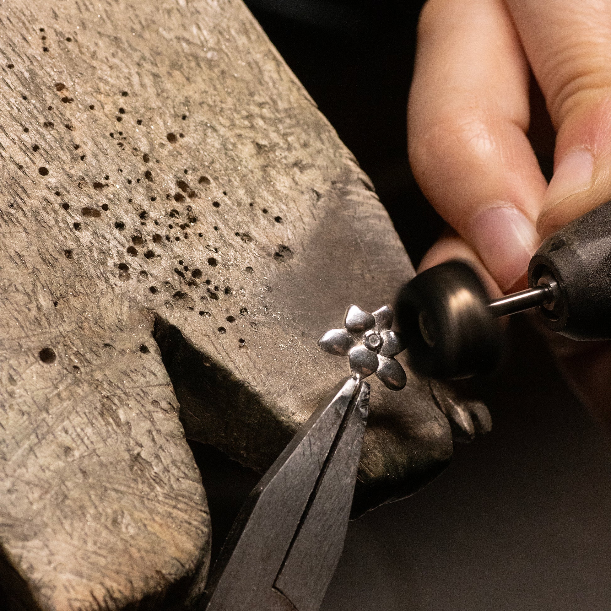 The freesia pendant is 1cm in diameter. It is made with recycled sterling silver.