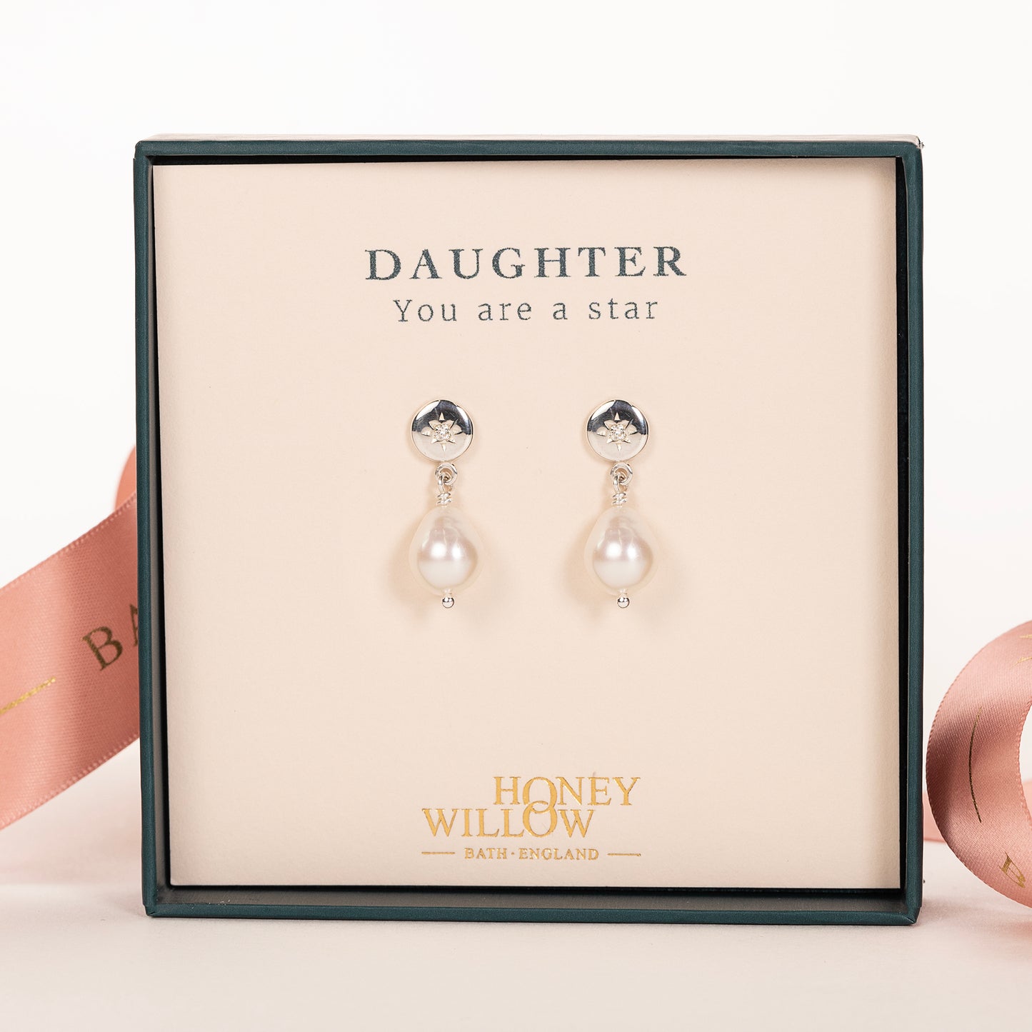 Gift for Daughter - Star Set Birthstone Earrings with Pearls - Silver