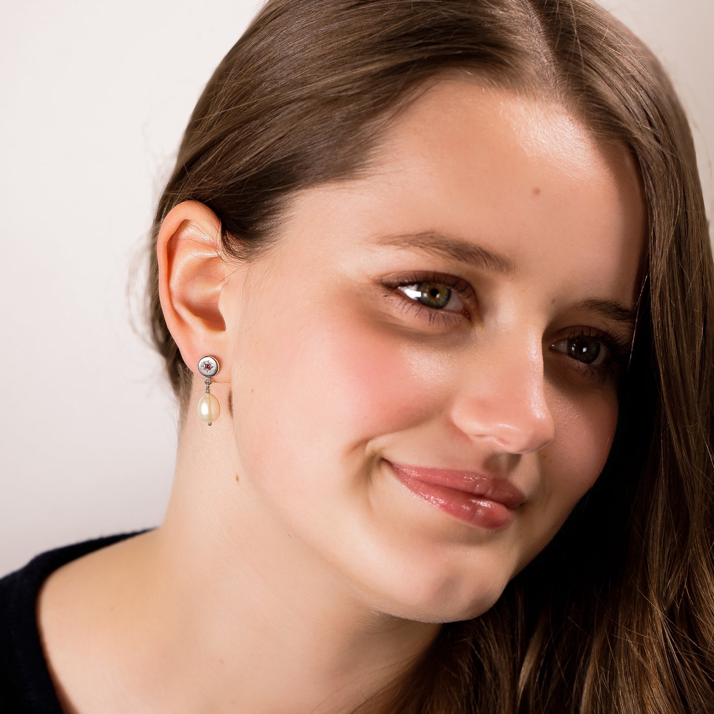 We make these earrings with sterling silver, freshwater pearls and genuine birthstones. Image 3 shows the birthstones we use. Please note that the diamond is lab-grown. Lab-grown diamonds are made from the same material as mined diamonds, without the ethical and environmental problems.