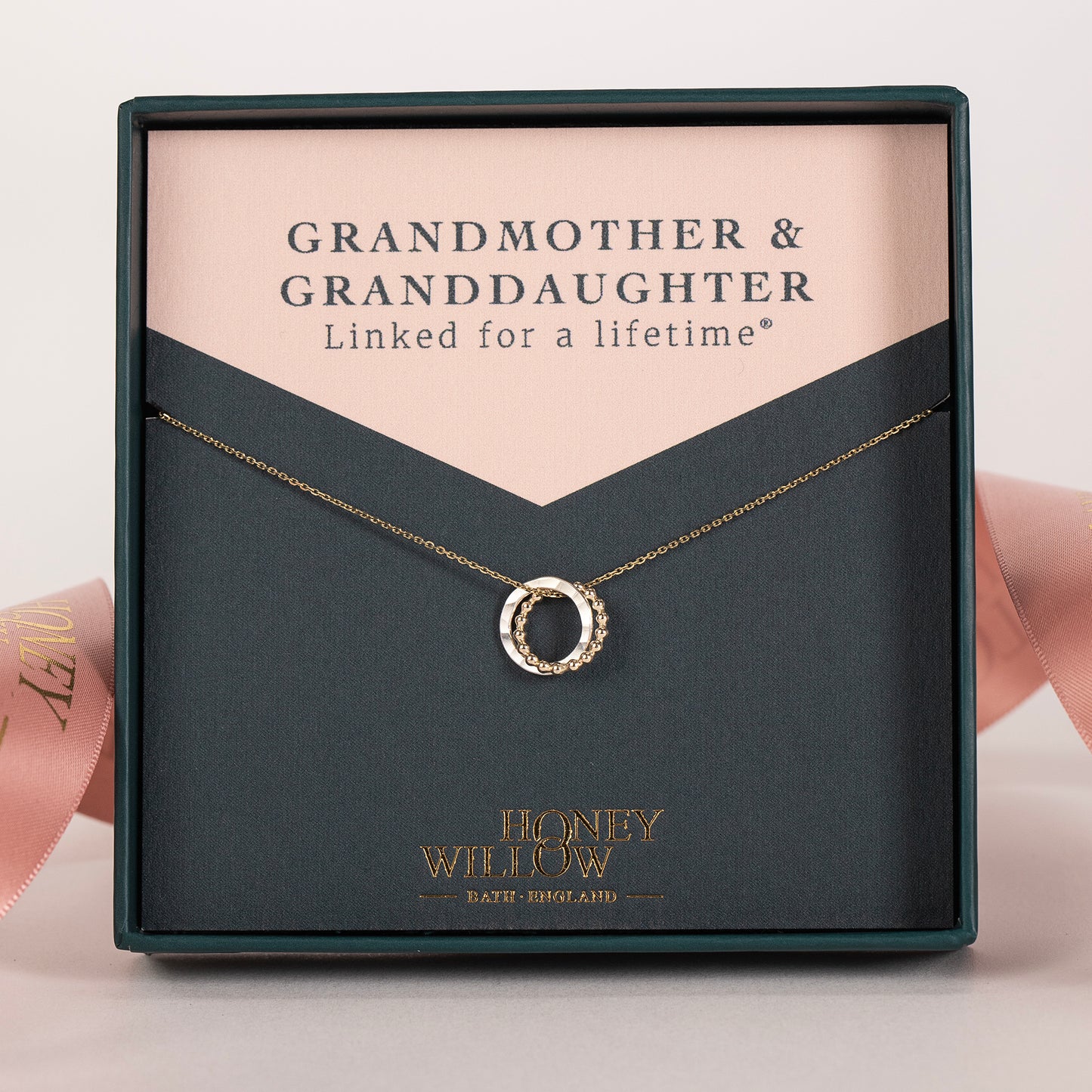 Celebrate the bond between grandmother and granddaughter with a dainty 9kt gold and silver love knot necklace.