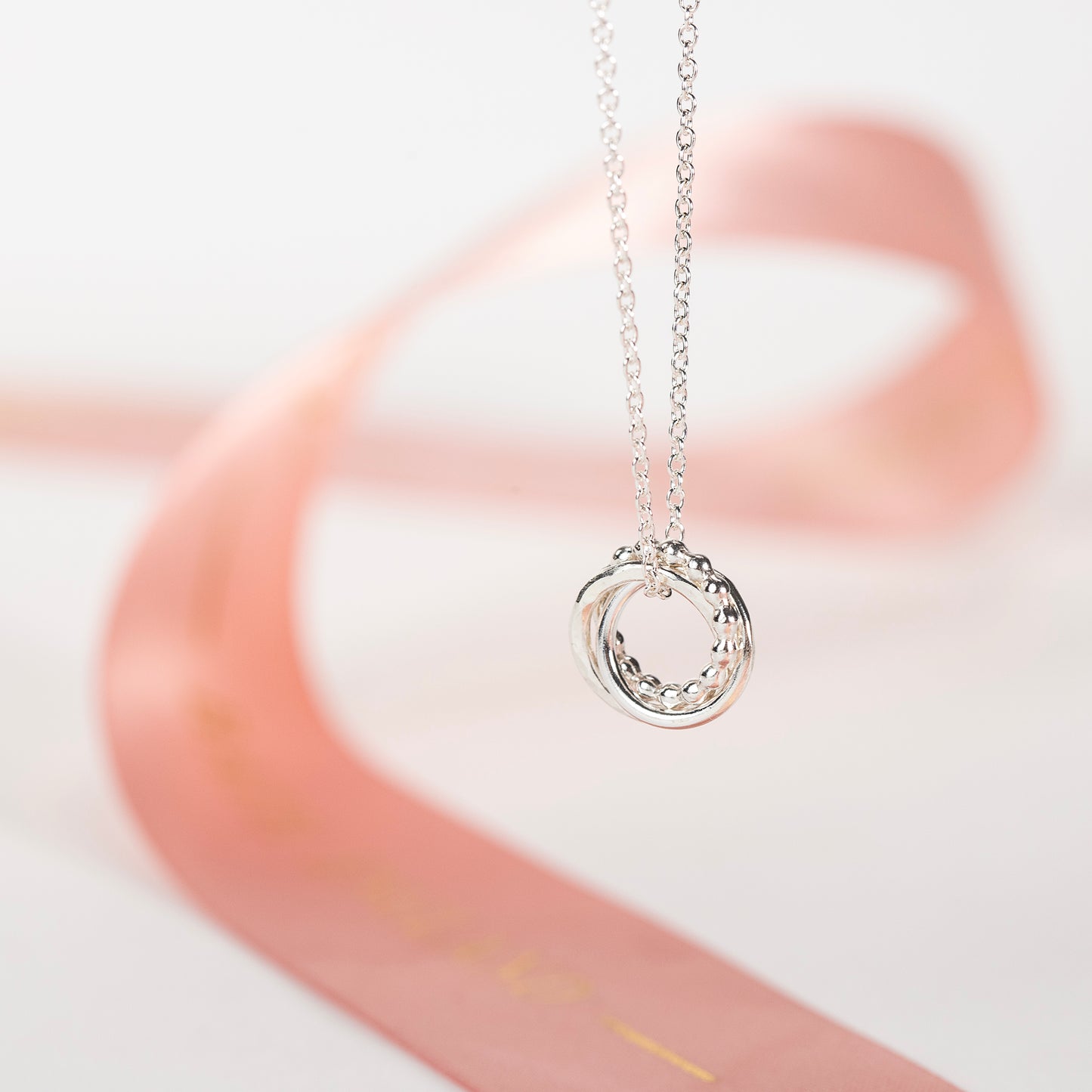 Circles symbolise infinite love, strength, protection and unity. We make her pendant with three linked circles, giving each link a different texture to represent each loved one.