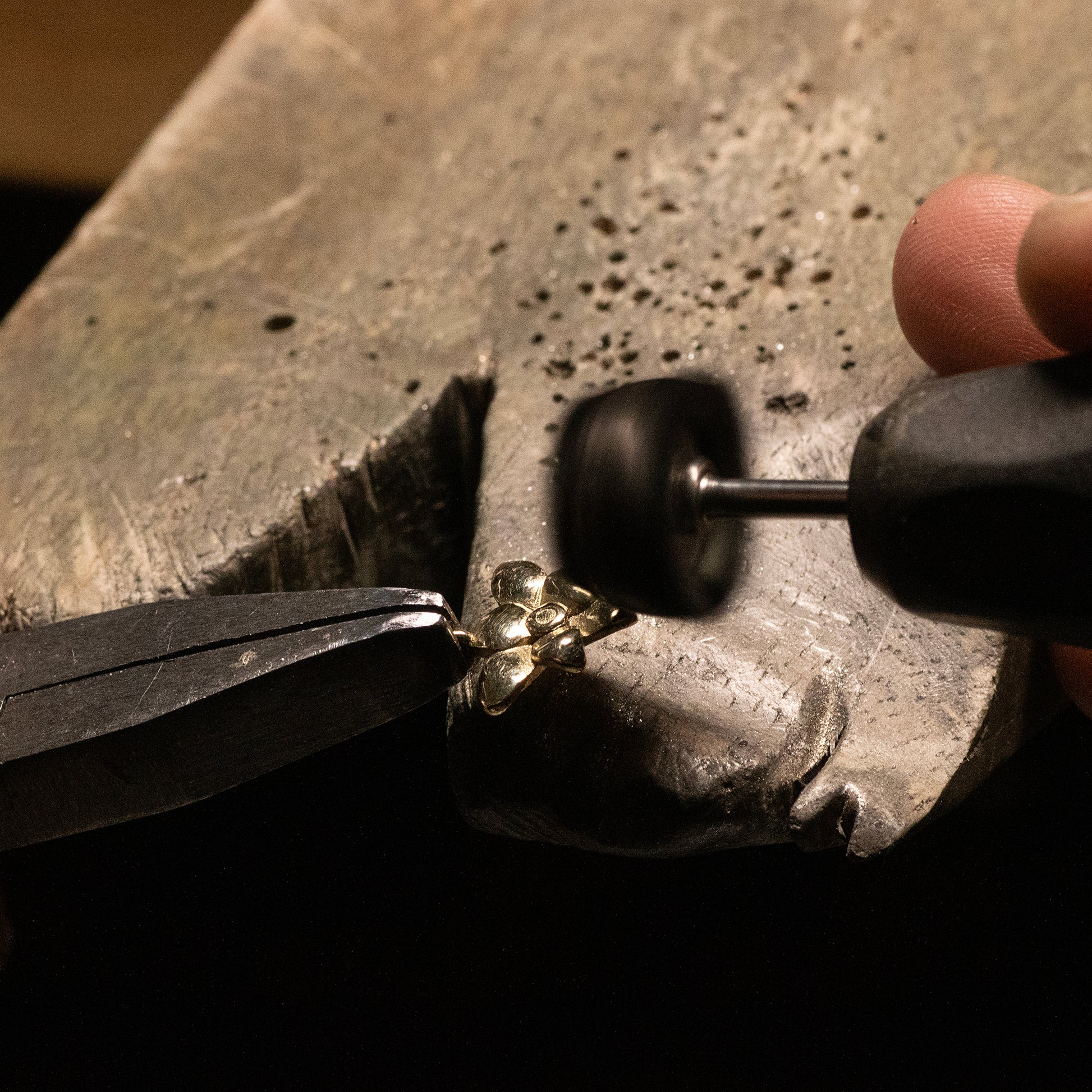 The freesia pendant is 1cm in diameter. It is made with recycled 9k gold and hallmarked at the London Assay Office.