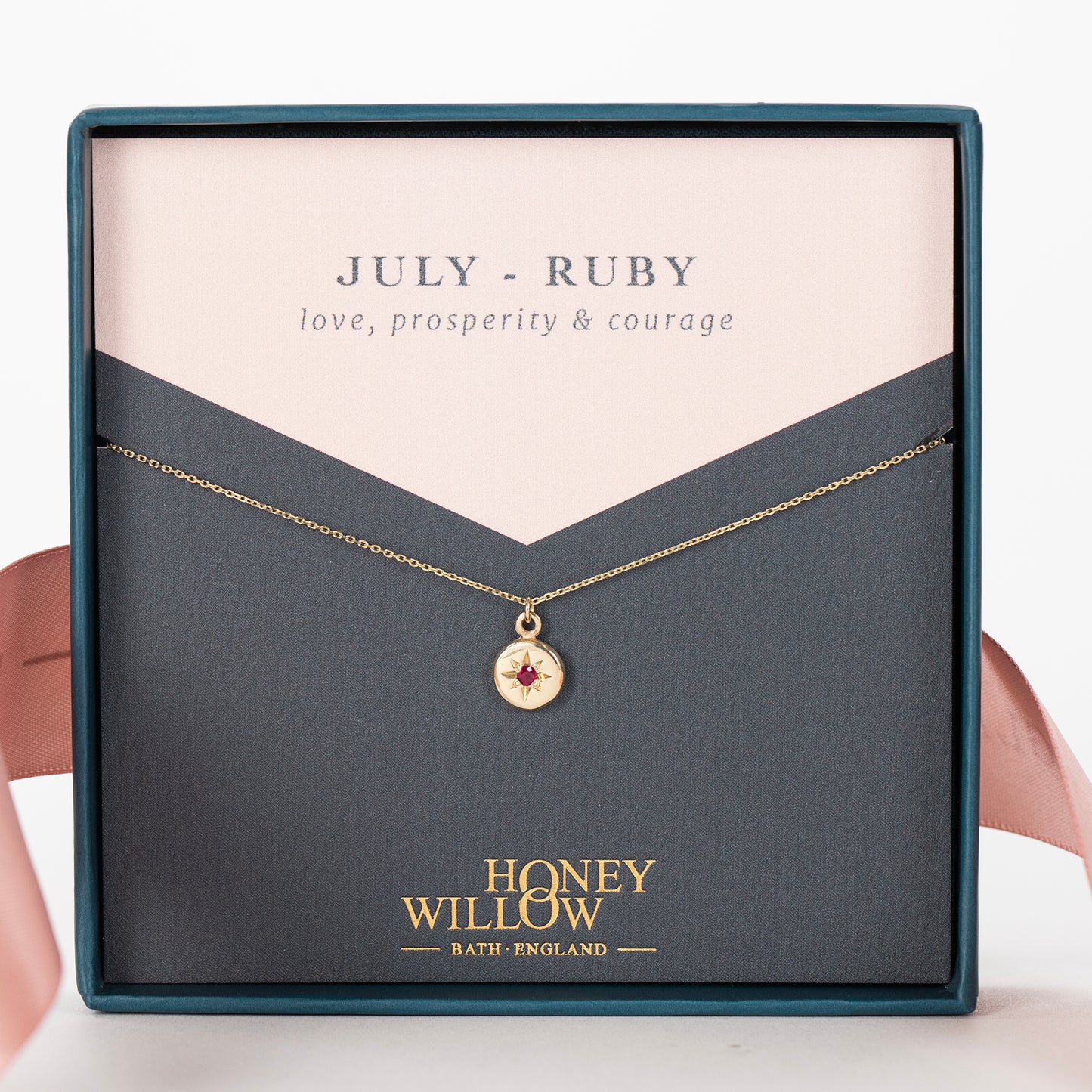 Celebrate her July birthday with a dainty 9kt gold necklace, star-set with a tiny ruby.