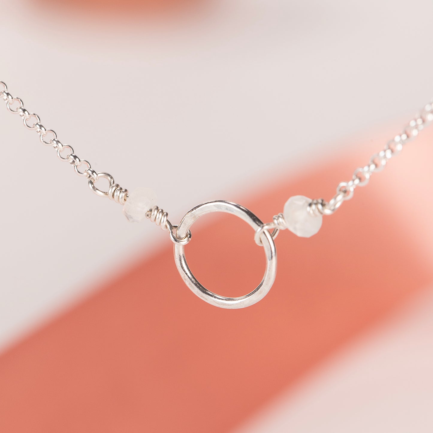 Circles symbolise infinite love, strength and protection. June's birthstone moonstone is on either side of the circle.
