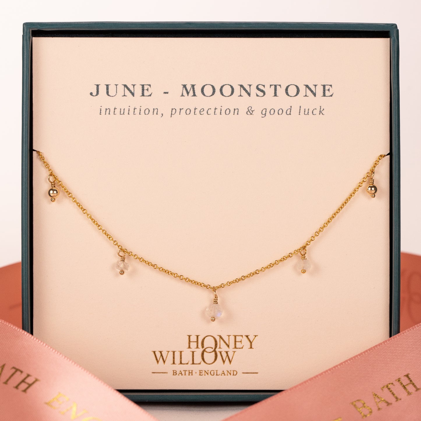 Celebrate your loved one's June birthday with a delicate necklace, handmade with a trio of her birthstones.