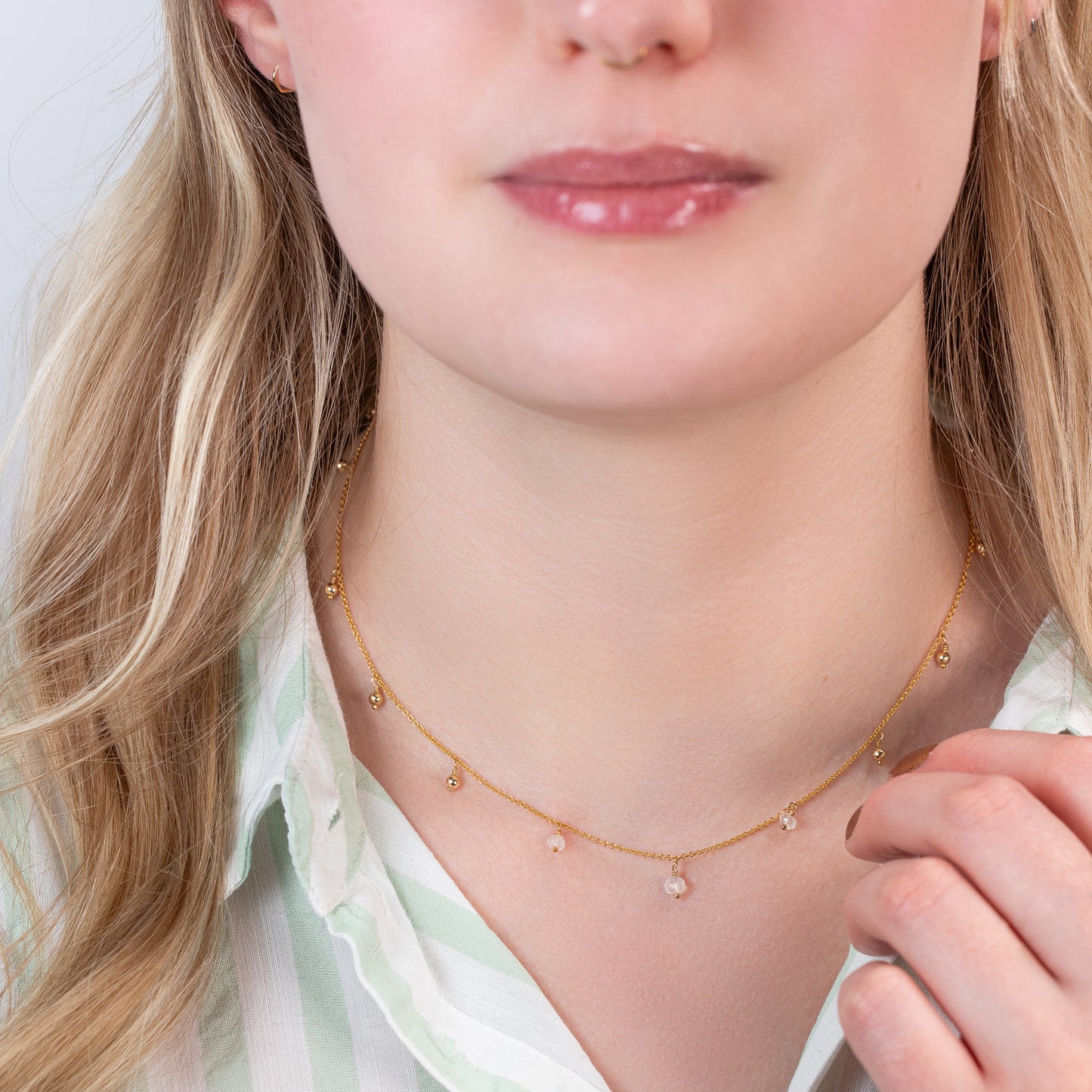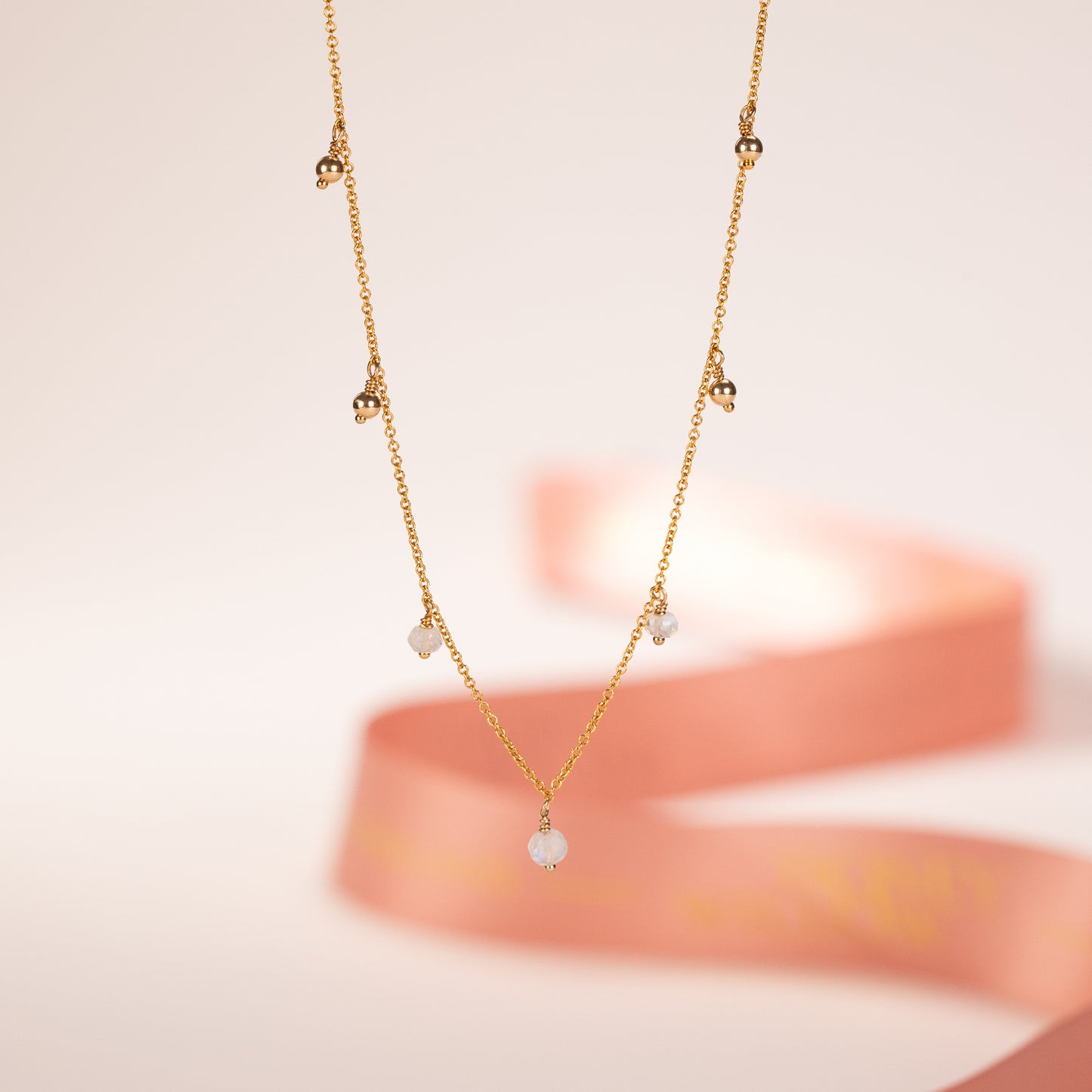 We place three birthstones at the front of the necklace then carry on around the necklace with silver or gold-fill balls.