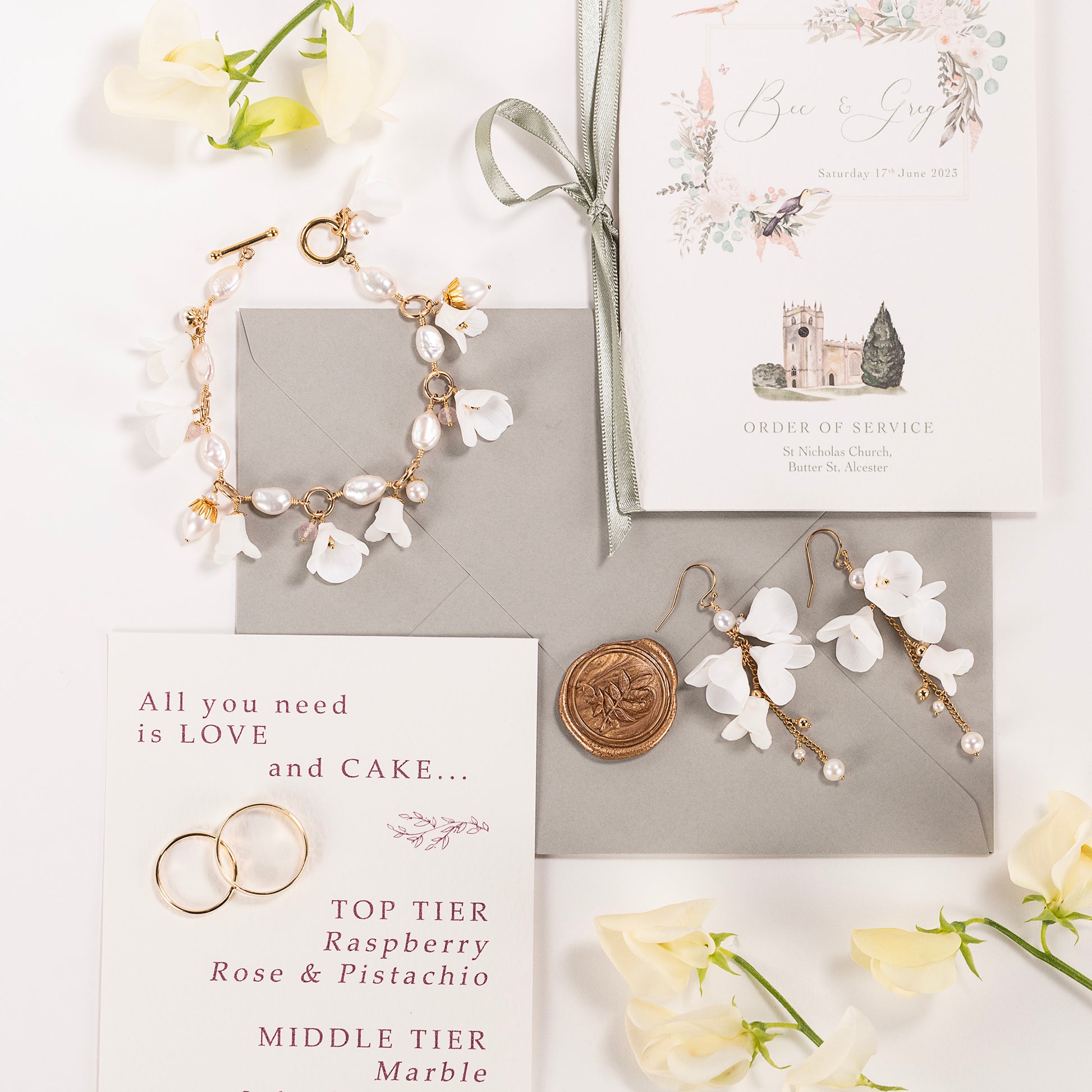 Make a statement with long, elegant earrings handmade with freshwater pearls and ceramic flowers.