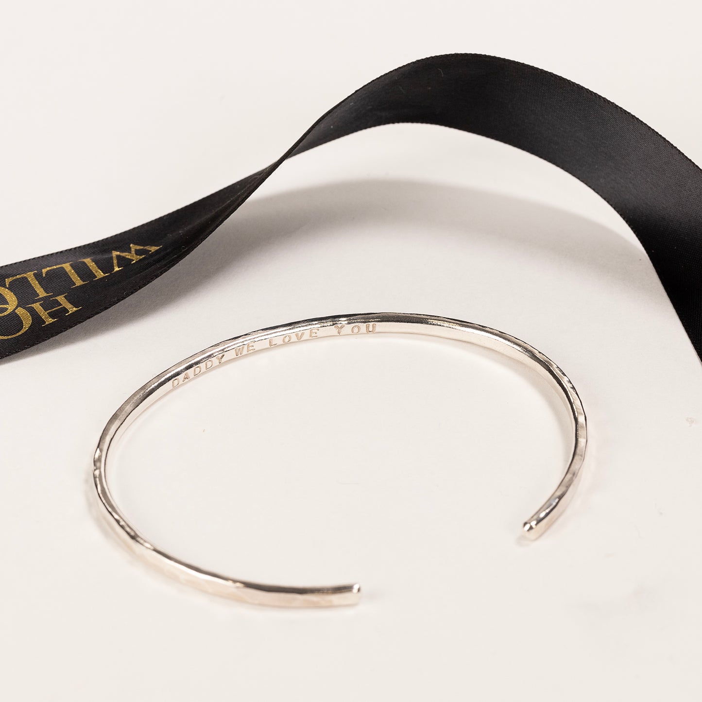 Please note that we hand-stamp this bangle, which gives a different finish to machine-engraved jewellery. There will be small irregularities, which are part of the character of a handmade piece.