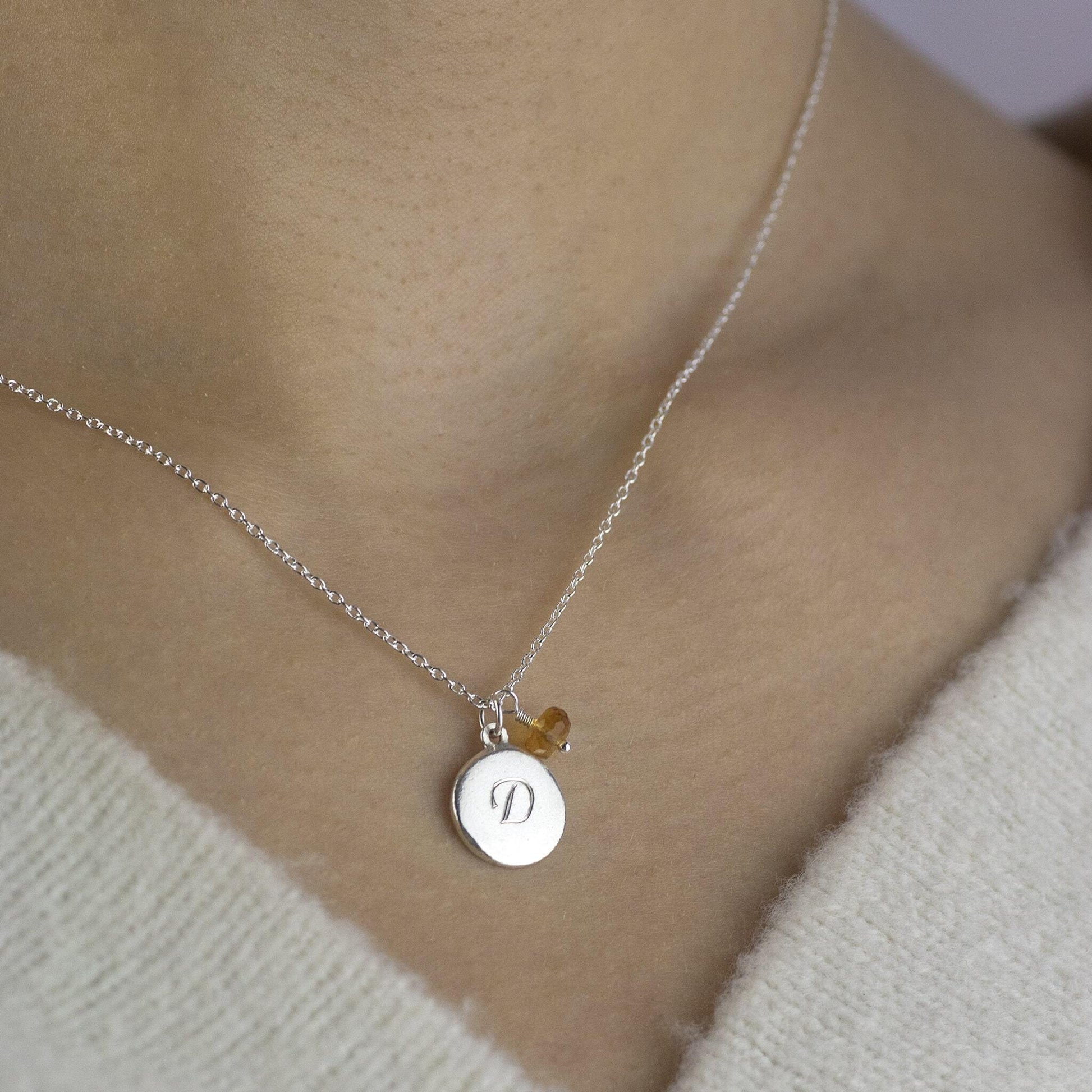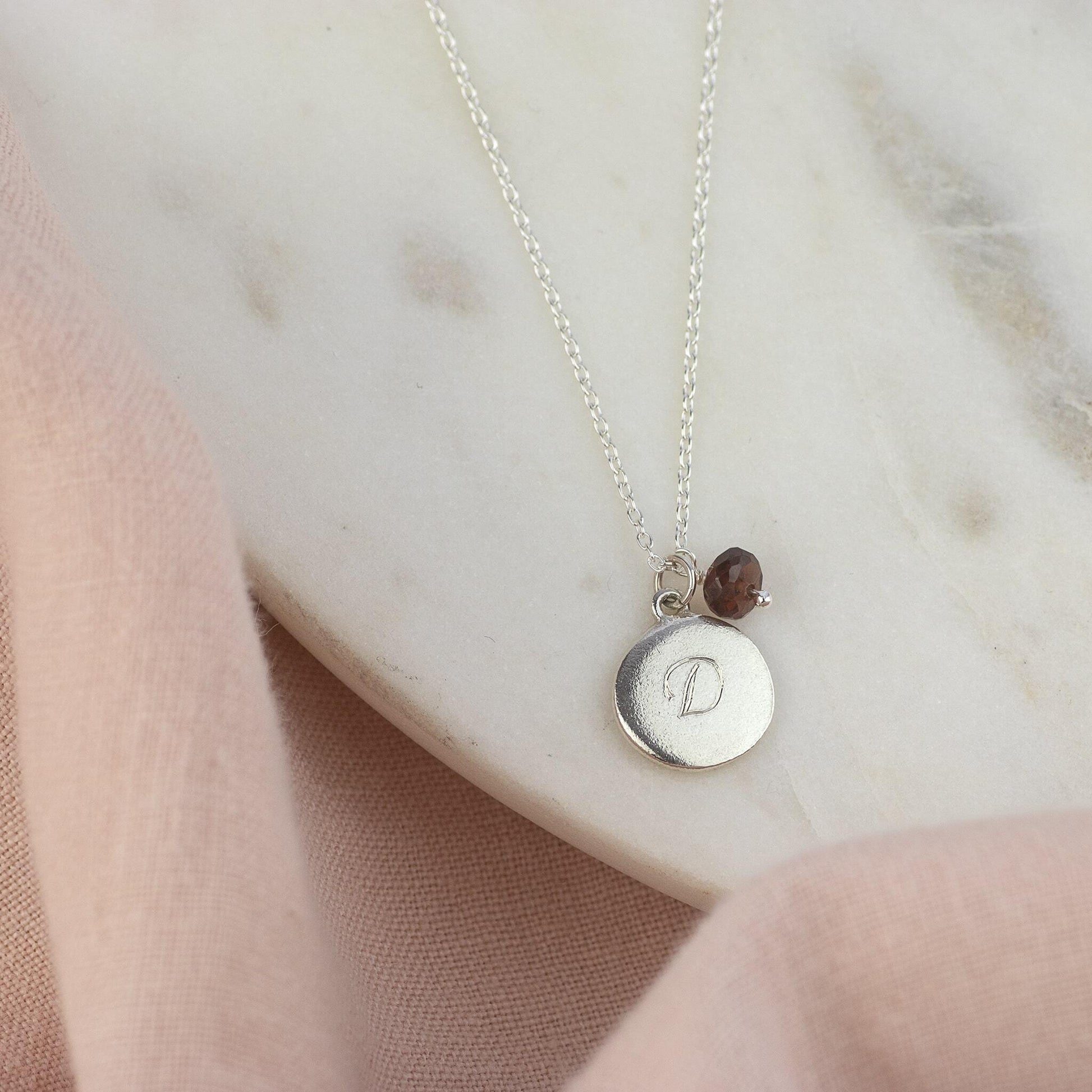Gift your loved one a dainty sterling silver pendant engraved with her initial, with her birthstone beside it.