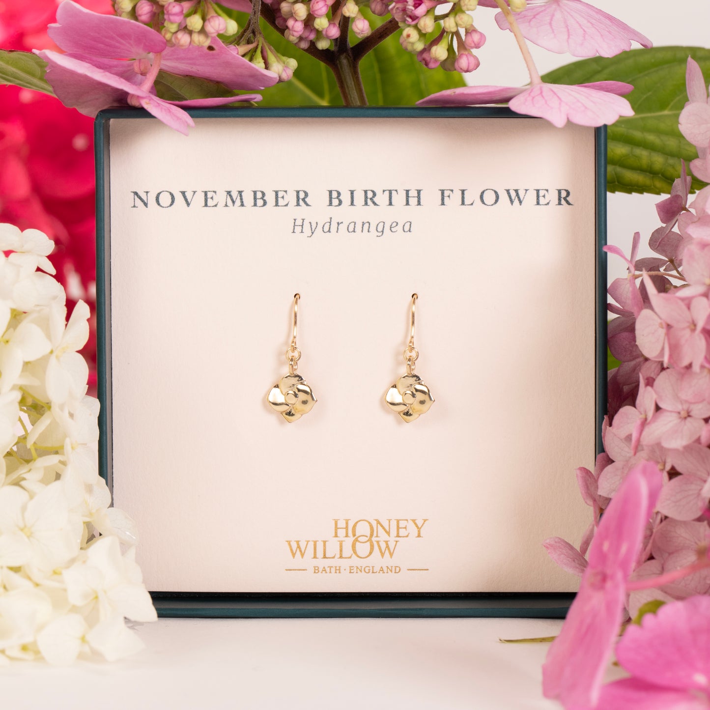 November Birth Flower Earrings - Hydrangea - 9kt Gold