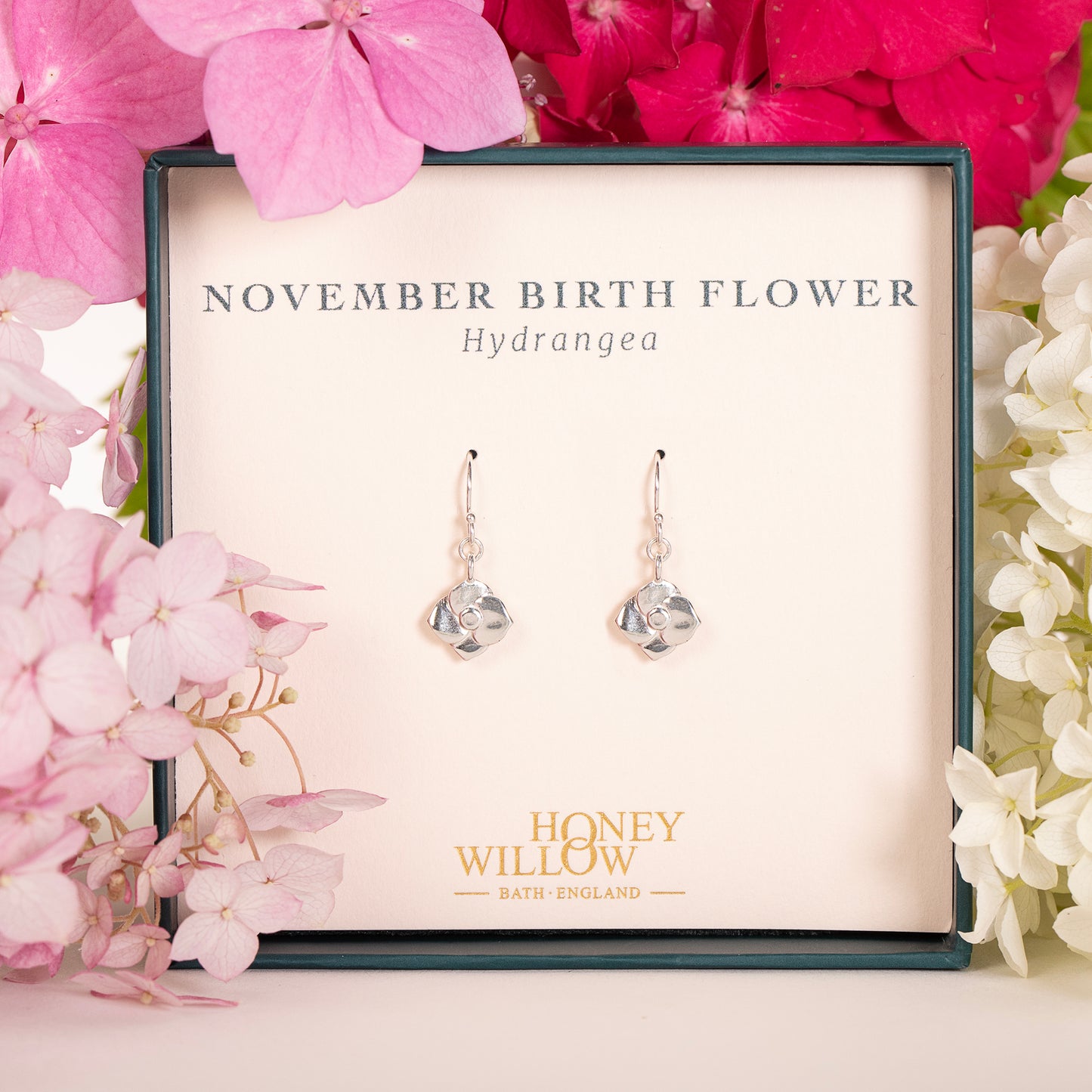 Celebrate her birth month with dainty hydrangea flower earrings, made with recycled silver.