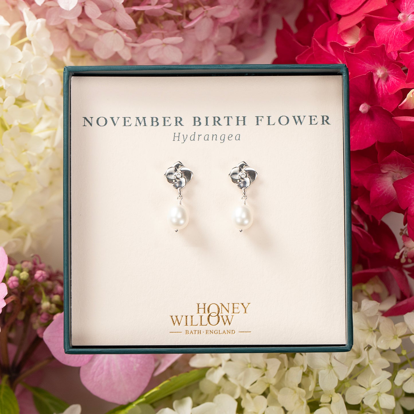 November Birth Flower Earrings - Hydrangea - Silver & Pearl