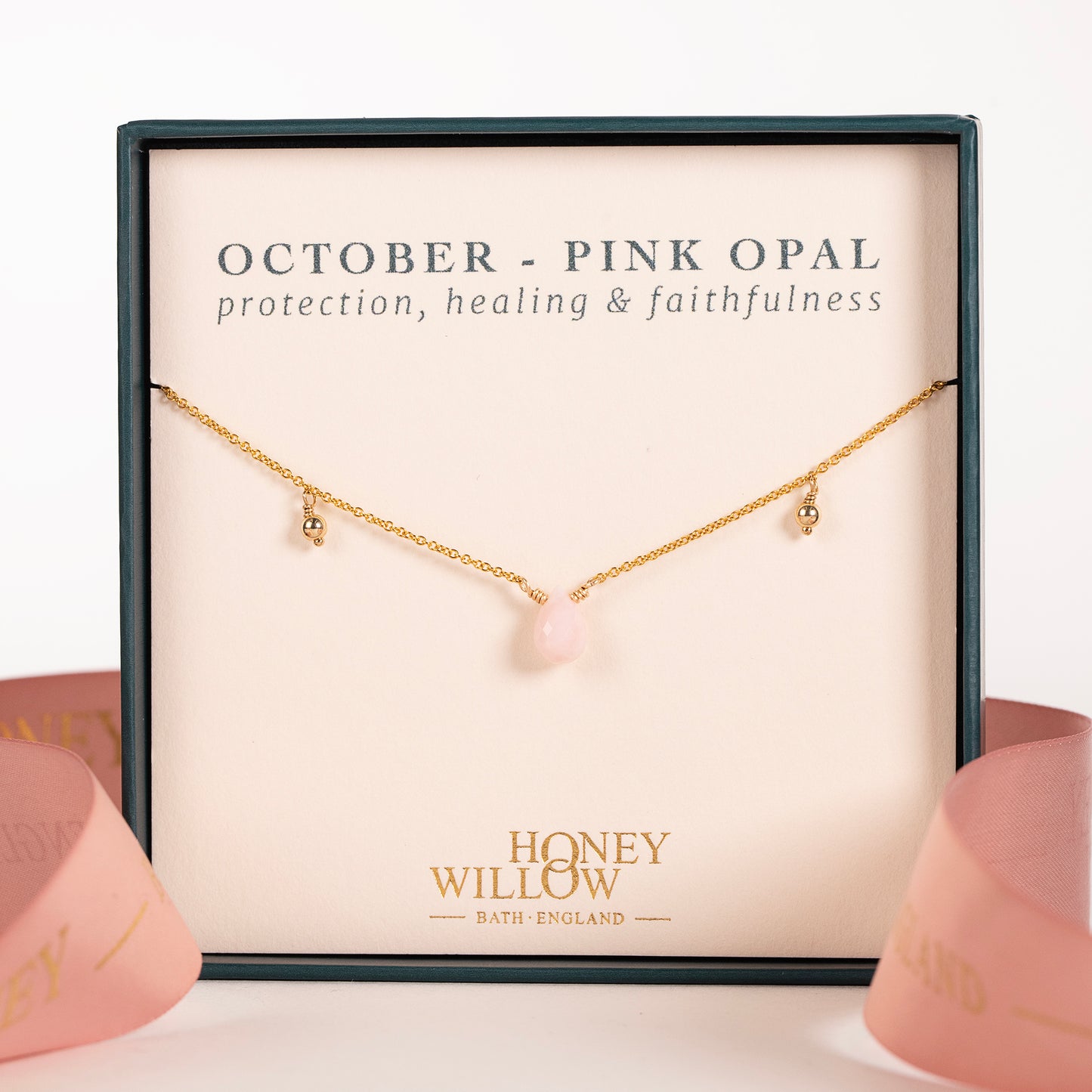 Celebrate her October birthday with a birthstone choker, handmade with pink opal, a birthstone for October and either silver or gold balls around the chain.